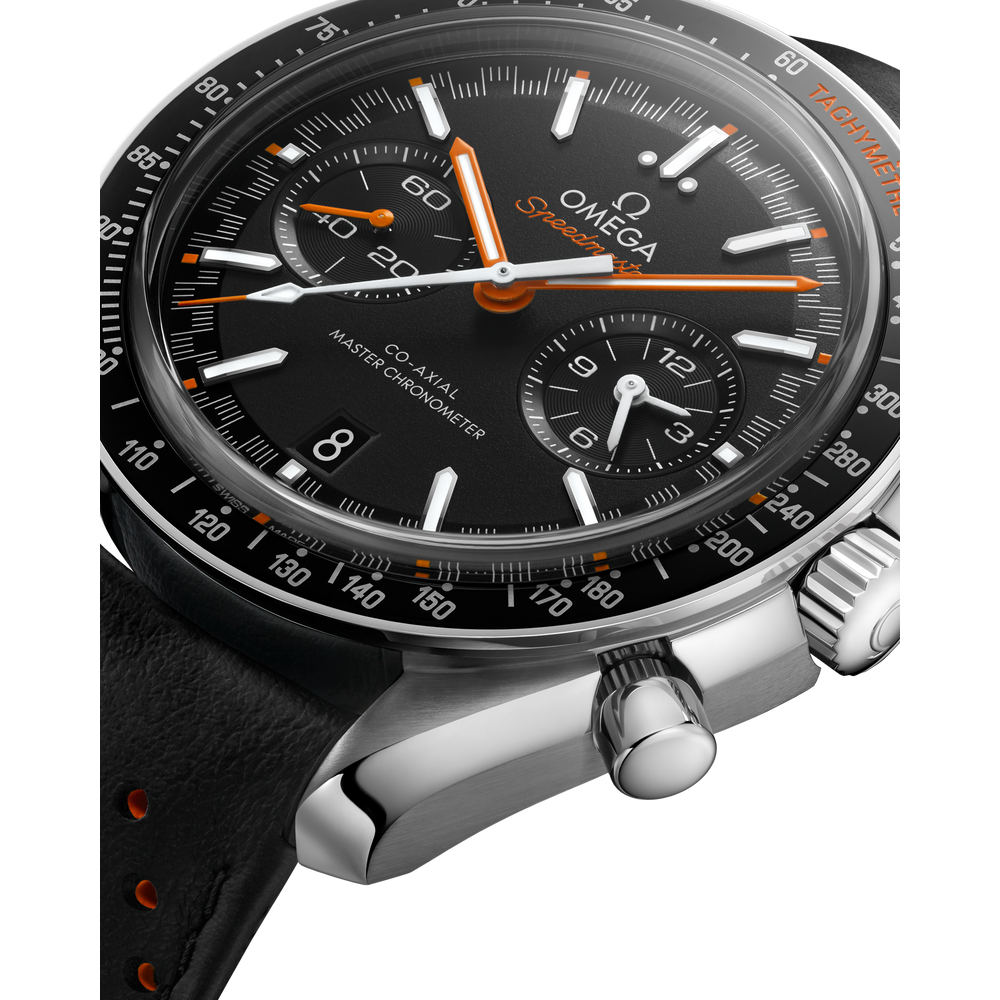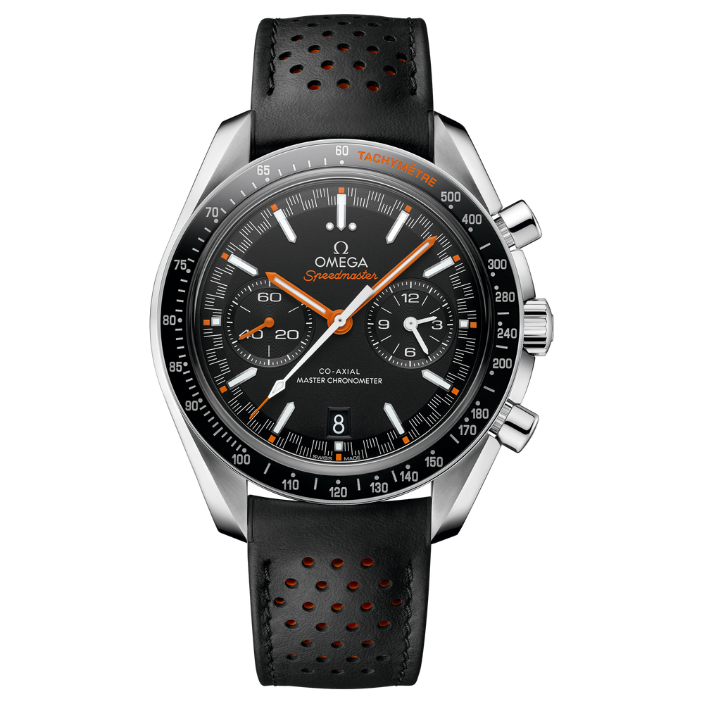 This Speedmaster Racing Master Chronometer model features a 44.25 mm stainless steel case with a black ceramic bezel ring that includes the famous tachymeter scale in orange wording and Liquidmetal™ numbers. The black leather strap is micro-perforated revealing an orange rubber interior.