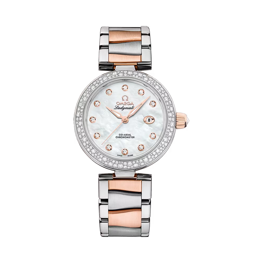 Radiating around the white pearled, mother-of-pearl dial, the bezel is also paved with snow-set diamonds, and an extra "Brilliant OMEGA cut" diamond has been placed within the polished crown.