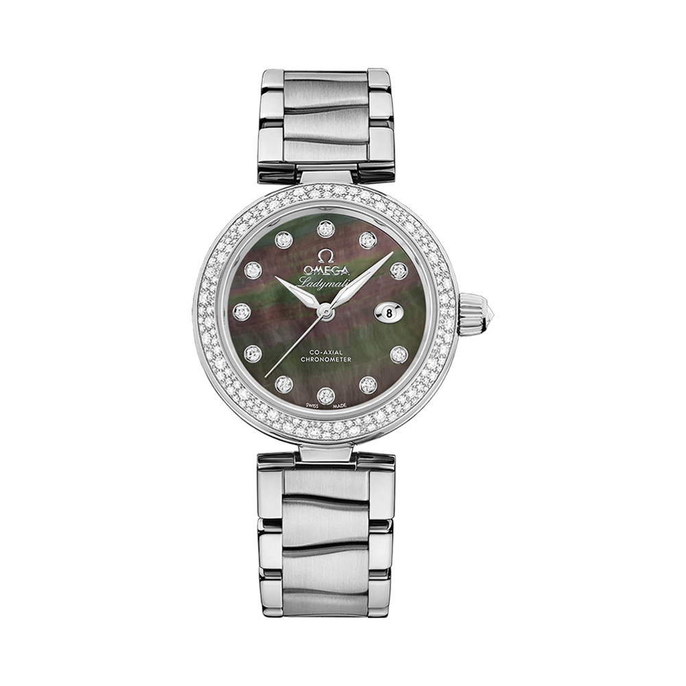 Radiating around the Tahiti mother-of-pearl dial, the bezel is also paved with snow-set diamonds, and an extra "Brilliant OMEGA cut" diamond has been placed within the polished crown.
