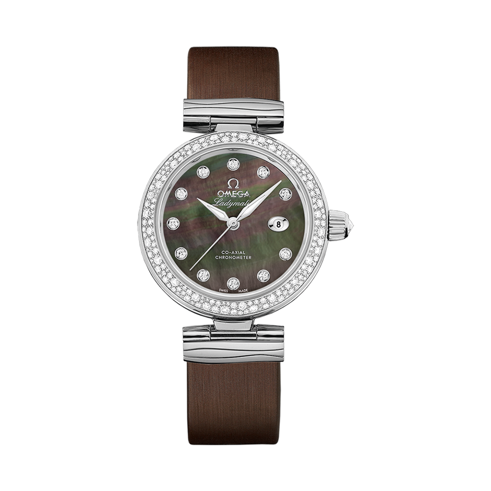 Radiating around the Tahiti mother-of-pearl dial, the bezel is also paved with snow-set diamonds, and an extra "Brilliant OMEGA cut" diamond has been placed within the polished crown.