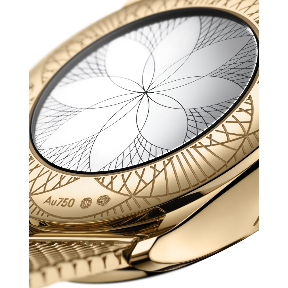This watch is set on an 18K Moonshine™ Gold mesh bracelet embossed with a silk-like pattern and special foldover clasp. Inside, it is driven by the OMEGA Calibre 4061, which sits behind a metallised sapphire crystal caseback with a mirror effect and “Her Time” pattern.