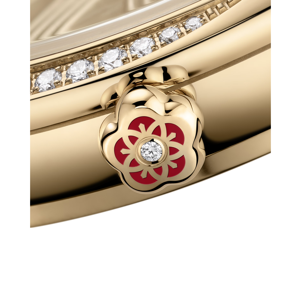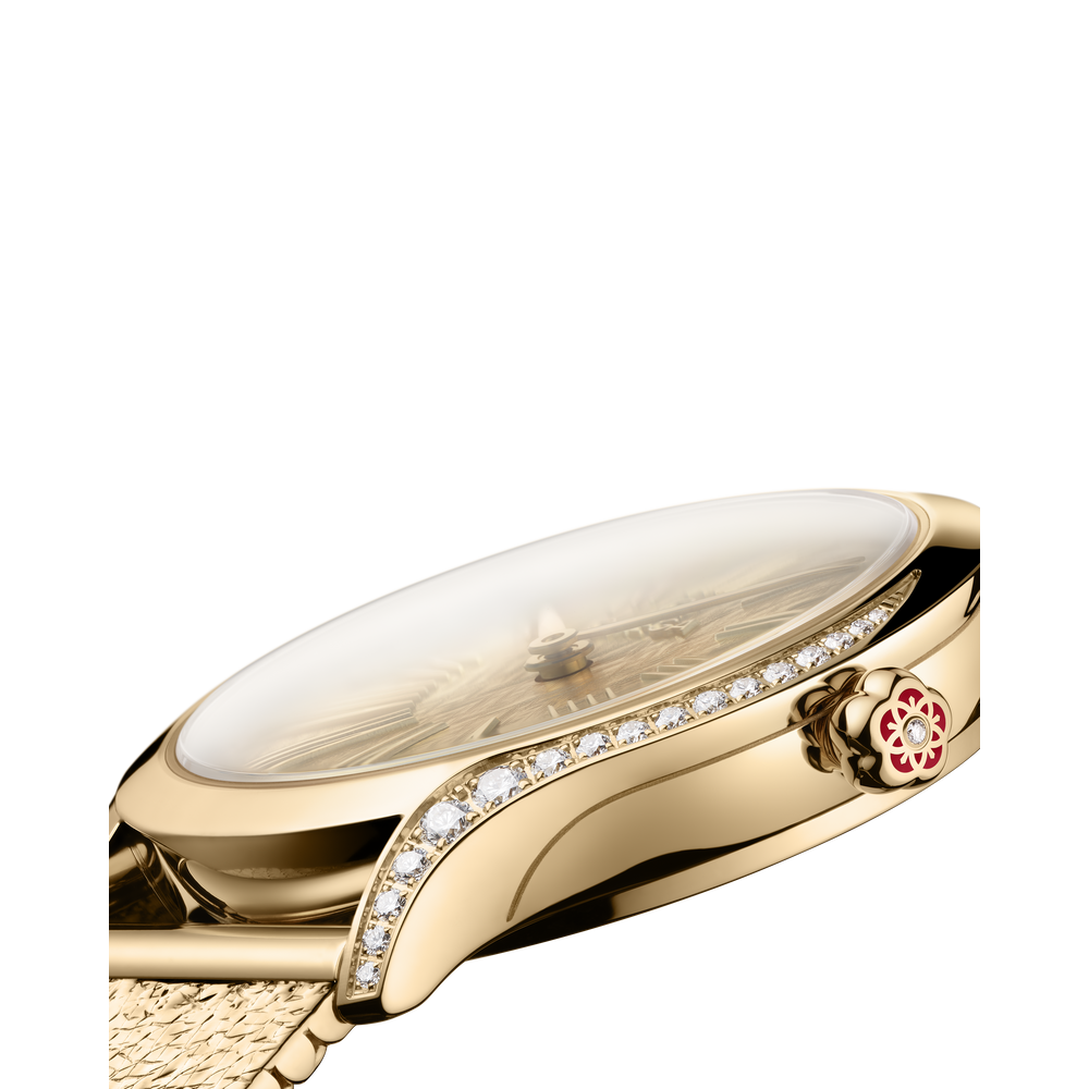 This model in 18K Moonshine™ Gold features a 26 mm case with diamonds that elegantly curve along each side. There is also a single diamond set in the crown, surrounded by a red liquid ceramic flower. The domed dial is crafted in 18K Moonshine™ Gold and is presented with a silk-like pattern that is contrasted with diamond-polished hands and embossed Roman Numeral indexes.