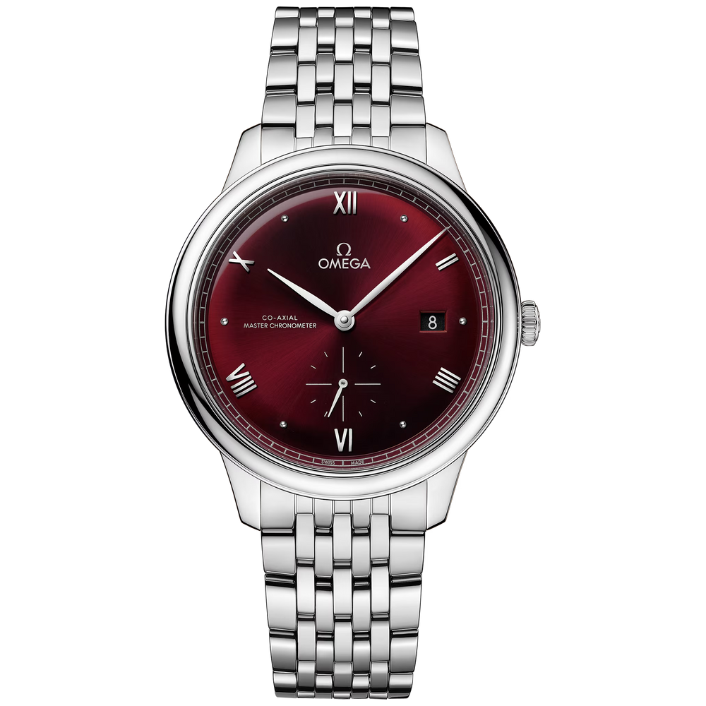 In this 41 mm stainless steel model, the domed PVD wine-burgundy dial features a sun-brushed finish. The display is distinguished by rhodium-plated hands, as well as alternating Roman numerals and cabochon indexes.
