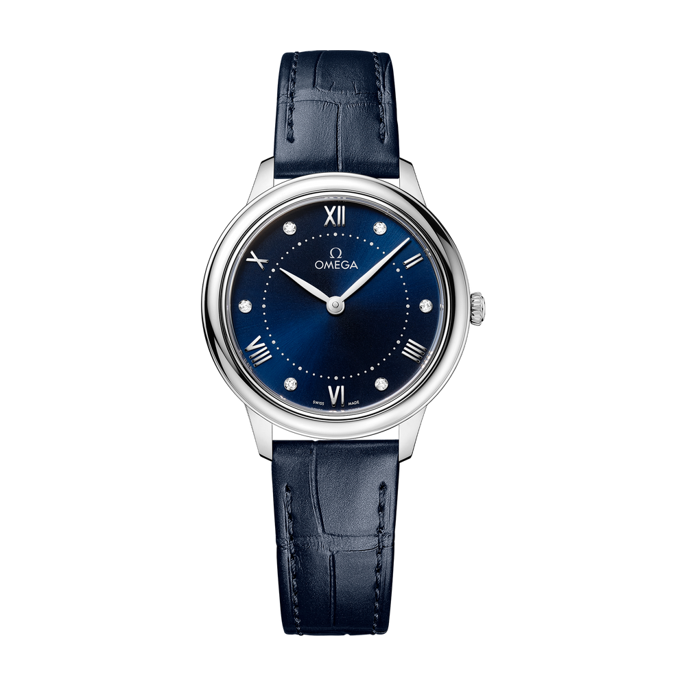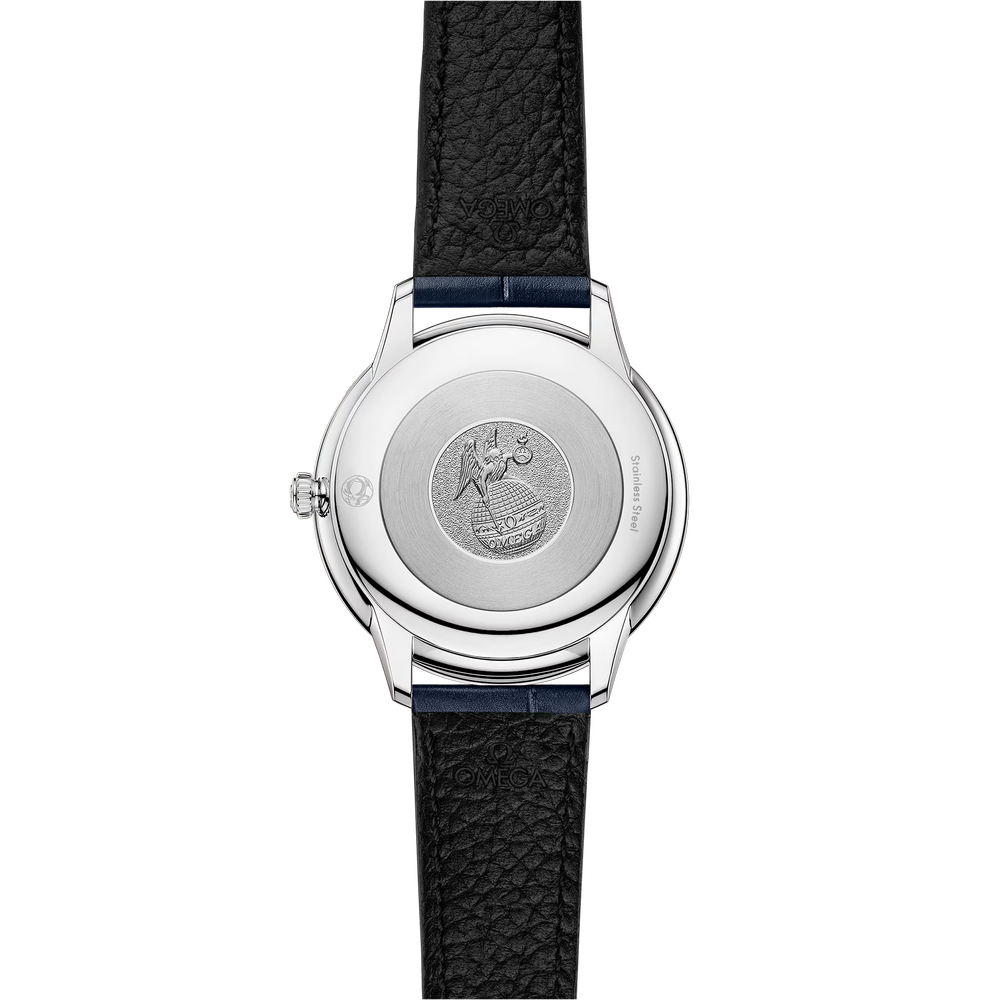 This watch is presented on a shimmering dark blue leather strap and is driven by the OMEGA Quartz Calibre 4061, with a battery life of at least 48 months.