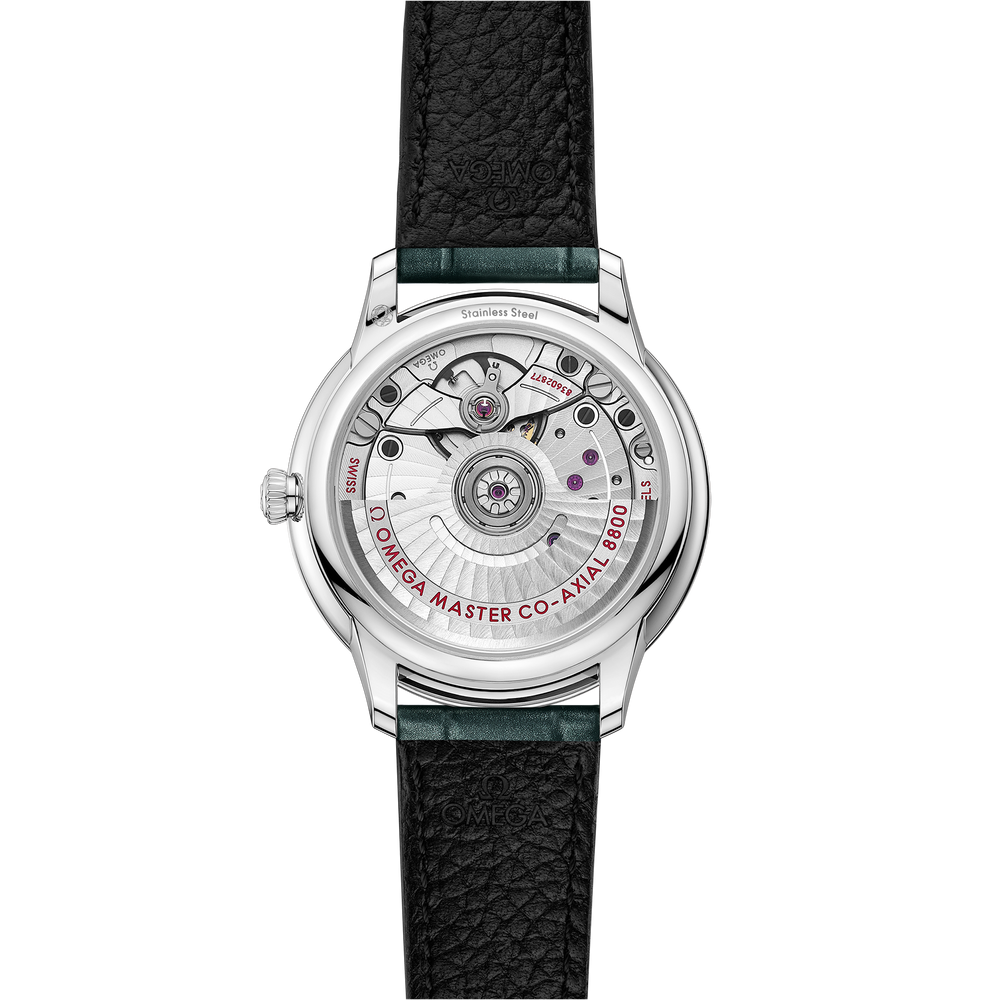 This Master Chronometer certified watch is presented on a shimmering pine green leather strap and is driven by the OMEGA Master Co-Axial Calibre 8800, which can be admired through the scratch-resistant sapphire crystal caseback.