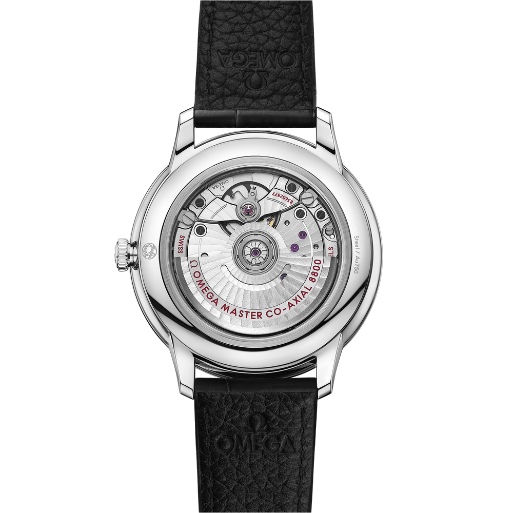 This Master Chronometer certified watch is presented on a black leather strap and is driven by the OMEGA Master Co-Axial Calibre 8800, which can be admired through the scratch-resistant sapphire crystal caseback.