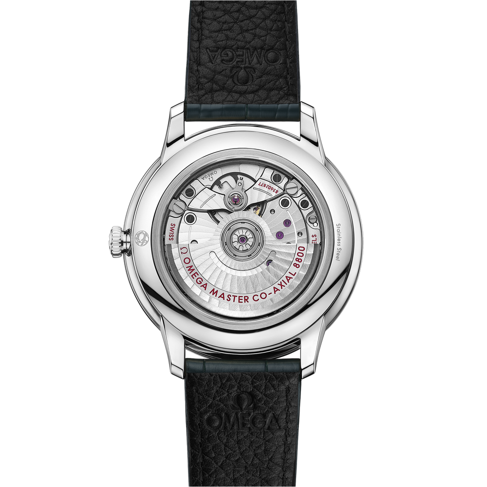 This Master Chronometer certified watch is presented on a pine green leather strap and is driven by the OMEGA Master Co-Axial Calibre 8800, which can be admired through the scratch-resistant sapphire crystal caseback.