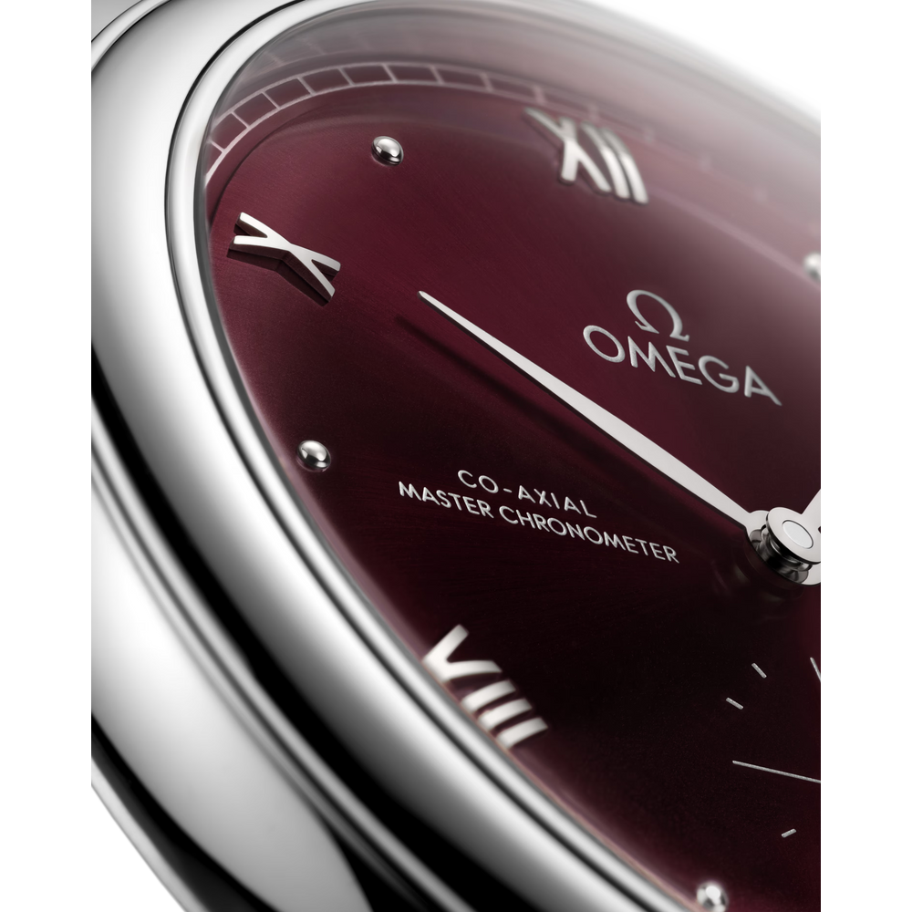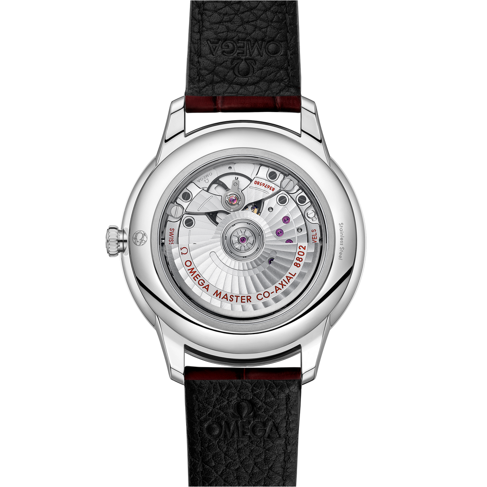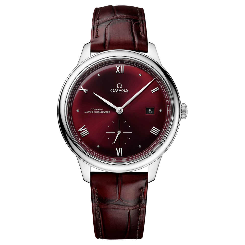 A timeless collection since 1994, the OMEGA De Ville Prestige is now in its third generation. Continuing to represent classical design and refined elegance, the timepieces offer a range of patterns, finishes and colours to suit different lifestyles and personalities.In this 41 mm stainless steel model, the domed PVD wine burgundy dial features a sun-brushed finish. The display is distinguished by rhodium-plated hands, as well as alternating Roman numerals and cabochon indexes.The pure look of the timepiece is completed by a date window at 3 o’clock, a small-seconds subdial at 6 o’clock, and a railway minute track on the outer zone.This Master Chronometer certified watch is presented on a burgundy leather strap and is driven by the OMEGA Master Co-Axial Calibre 8802, which can be admired through the scratch-resistant sapphire crystal caseback.