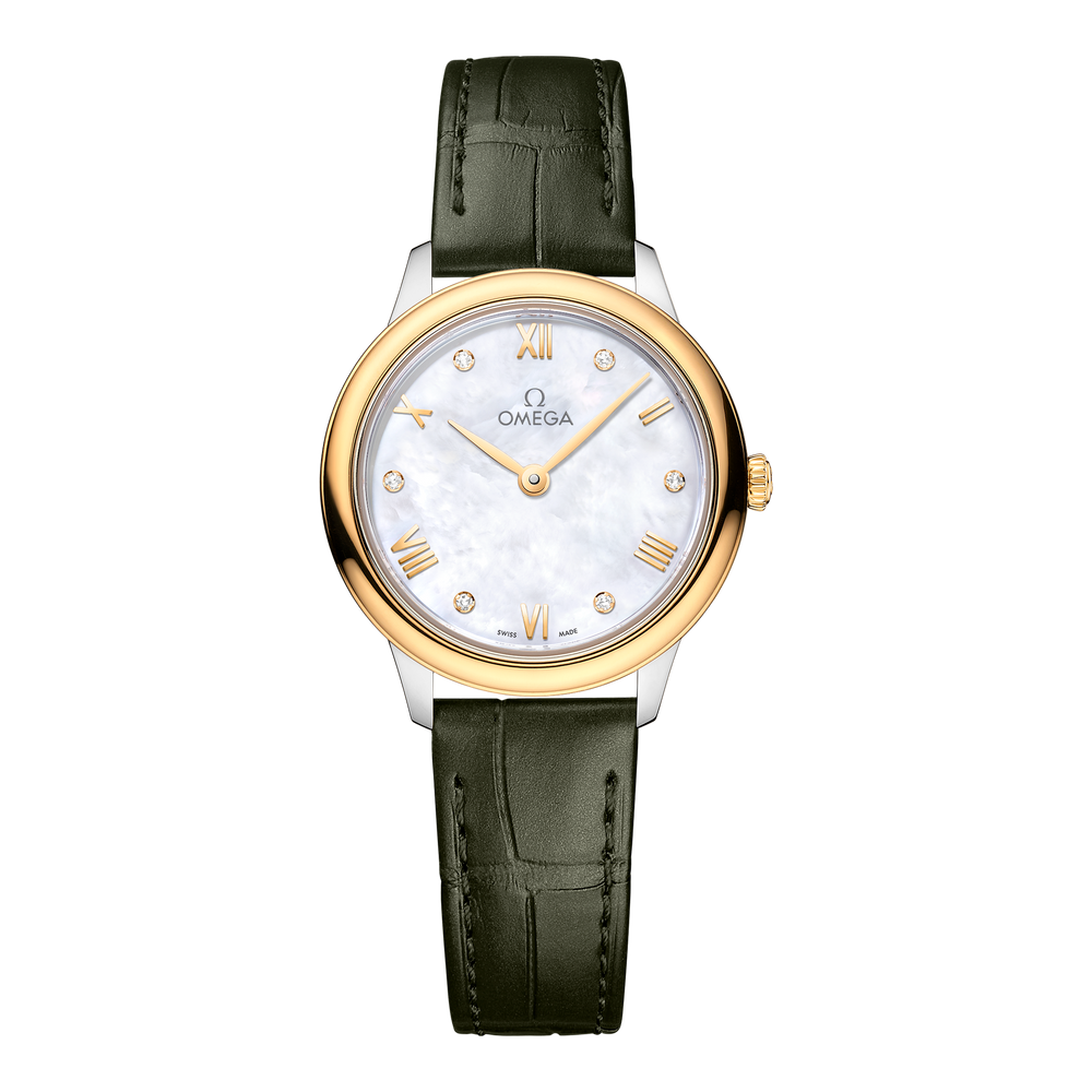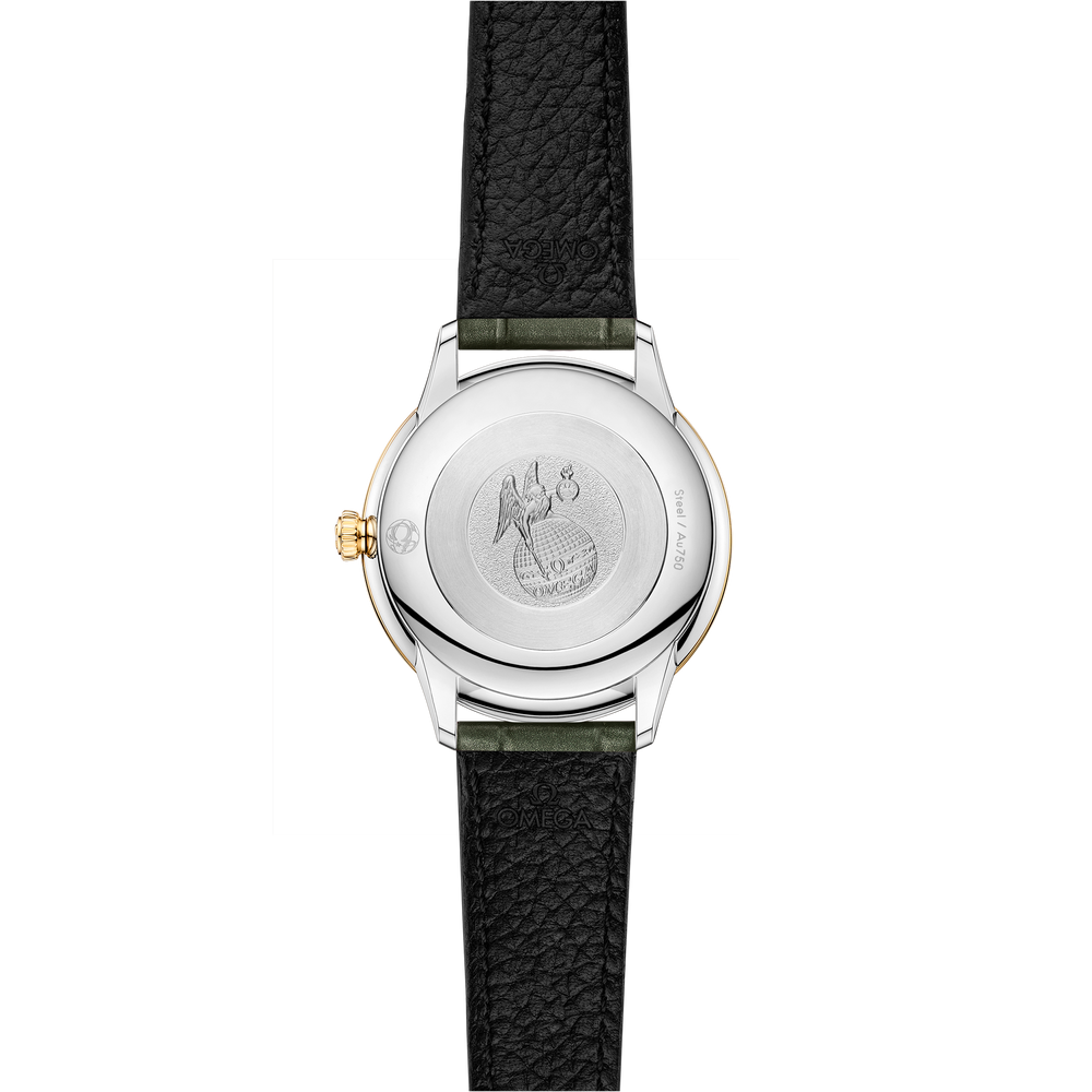 This watch is presented on a shimmering olive green leather strap and is driven by the OMEGA Quartz Calibre 4061, with a battery life of at least 48 months.