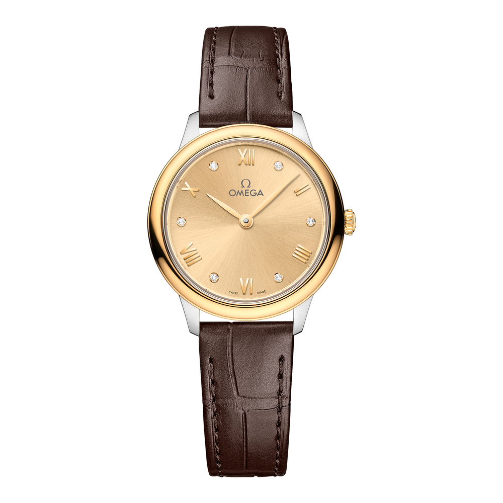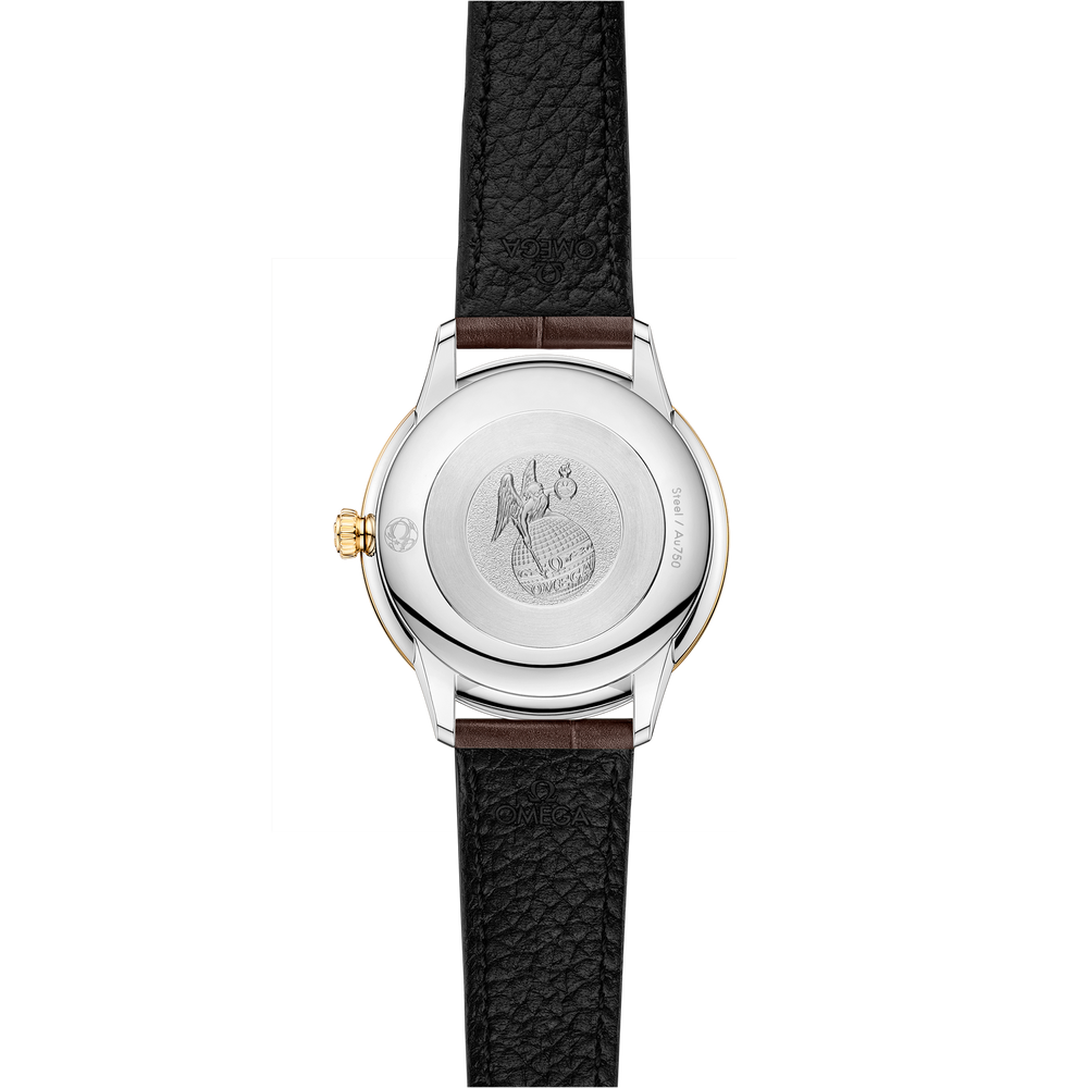 This watch is presented on a shimmering brown leather strap and is driven by the OMEGA Quartz Calibre 4061, with a battery life of at least 48 months.