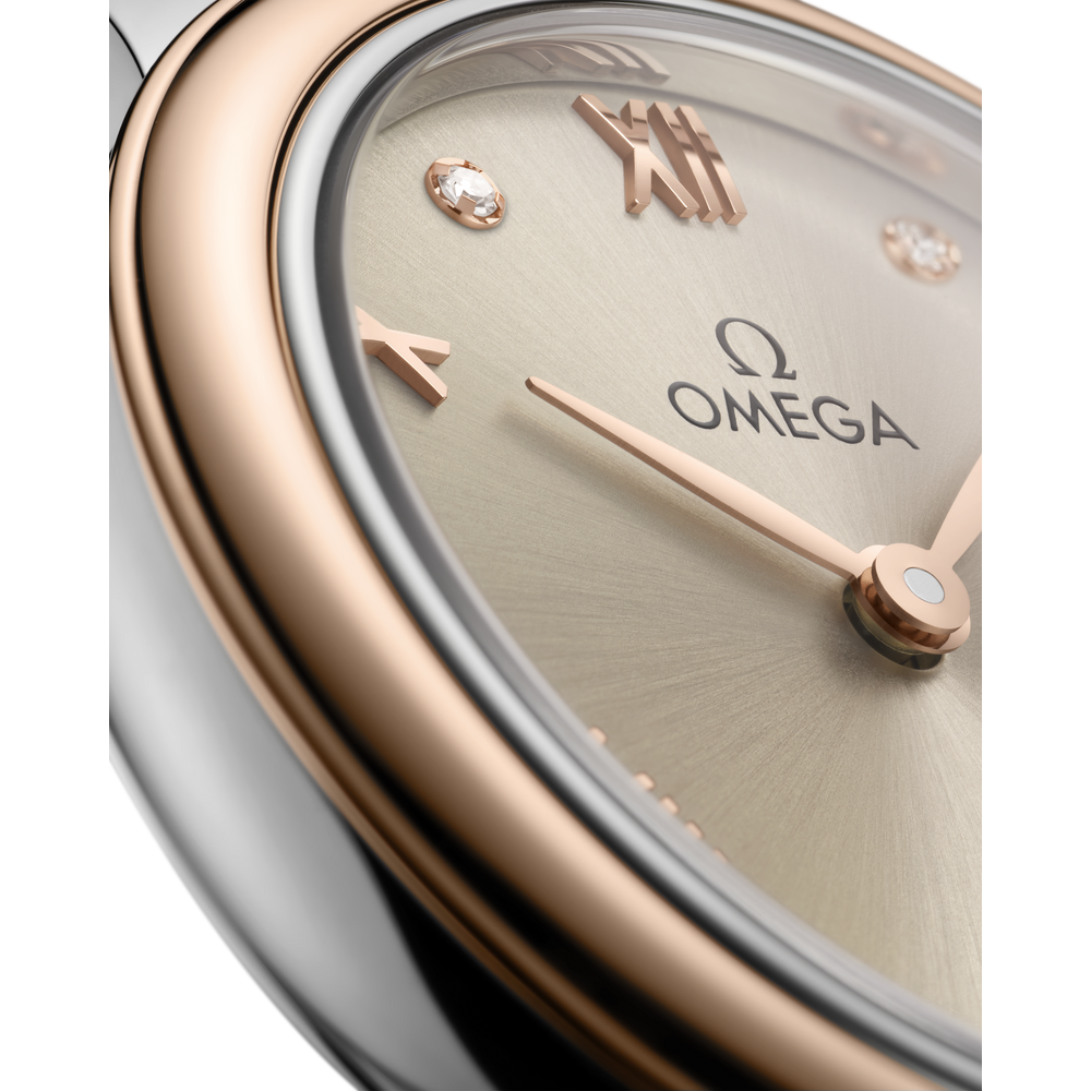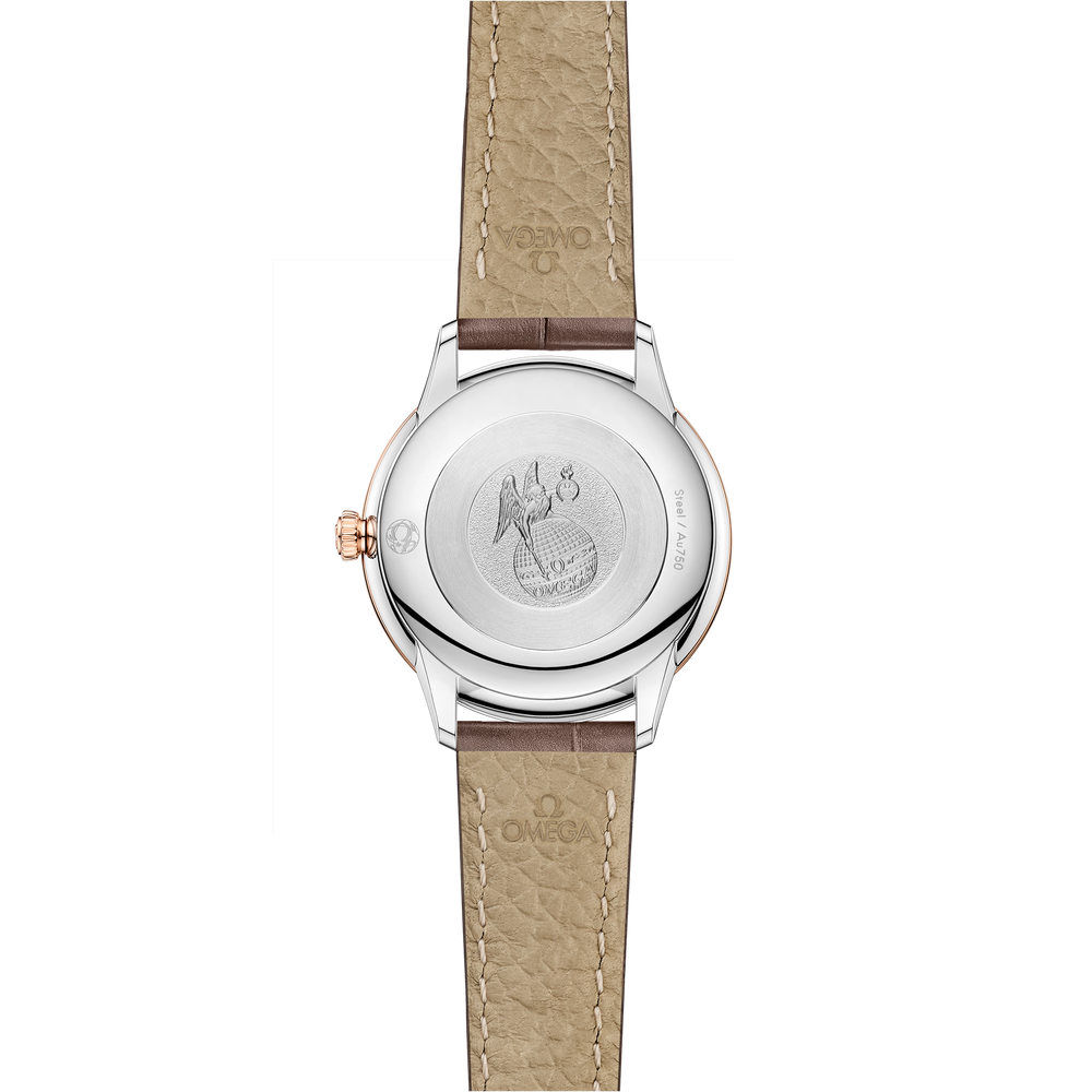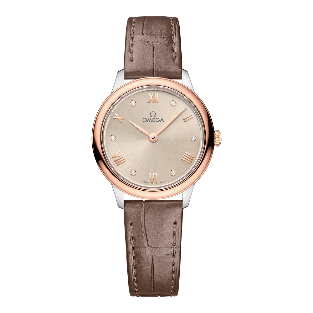 This watch is presented on a shimmering taupe brown leather strap and is driven by the OMEGA Quartz Calibre 4061, with a battery life of at least 48 months.