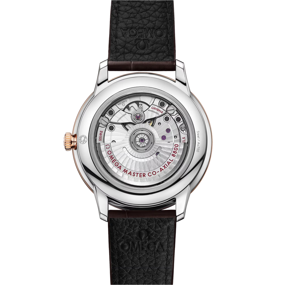 This Master Chronometer certified watch is presented on a brown leather strap and is driven by the OMEGA Master Co-Axial Calibre 8800, which can be admired through the scratch-resistant sapphire crystal caseback.