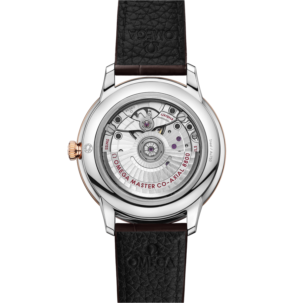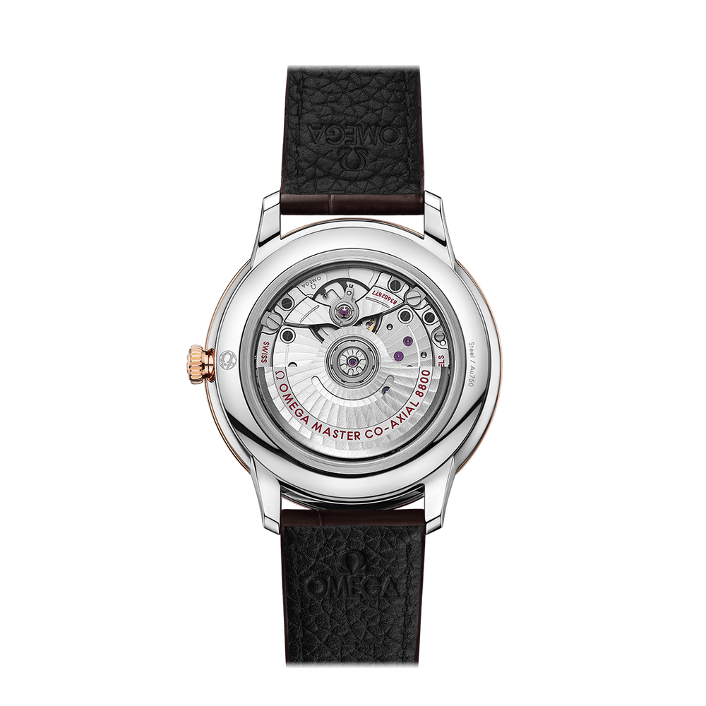 This Master Chronometer certified watch is presented on a brown leather strap and is driven by the OMEGA Master Co-Axial Calibre 8800, which can be admired through the scratch-resistant sapphire crystal caseback.