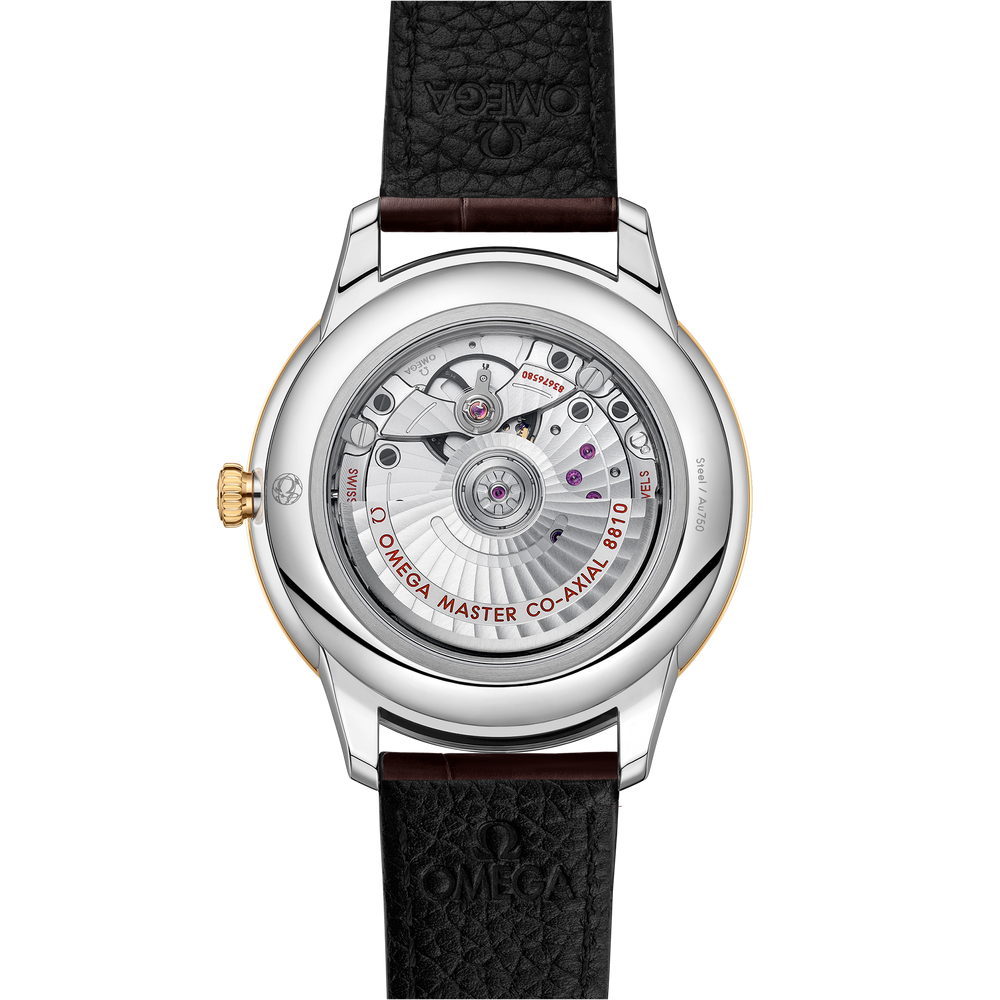This Master Chronometer certified watch is presented on a brown leather strap and is driven by the OMEGA Master Co-Axial Calibre 8810, which can be admired through the scratch-resistant sapphire crystal caseback.