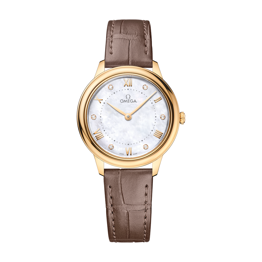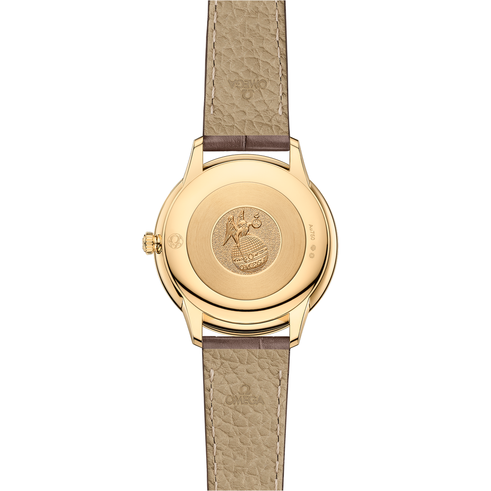This watch is presented on a shimmering taupe brown leather strap and is driven by the OMEGA Quartz Calibre 4061, with a battery life of at least 48 months.