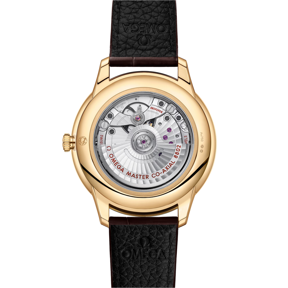 This Master Chronometer certified watch is presented on a brown leather strap and is driven by the OMEGA Master Co-Axial Calibre 8802, which can be admired through the scratch-resistant sapphire crystal caseback.