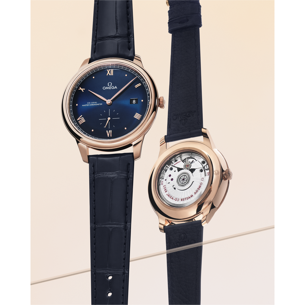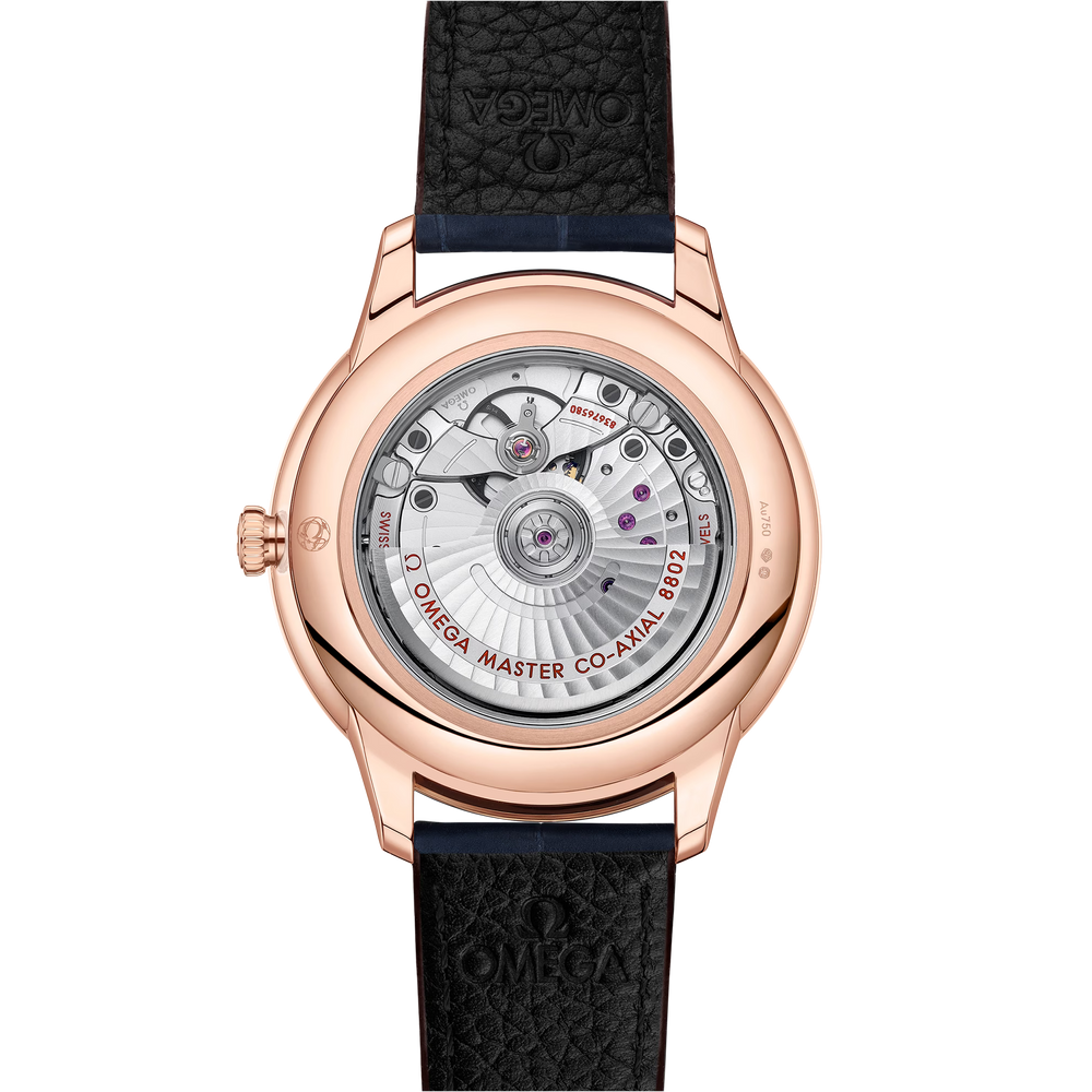 This Master Chronometer certified watch is presented on a dark blue leather strap and is driven by the OMEGA Master Co-Axial Calibre 8802, which can be admired through the scratch-resistant sapphire crystal caseback.
