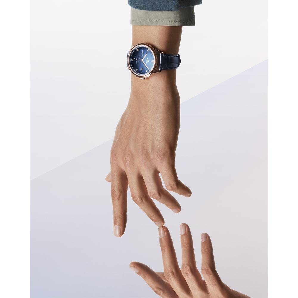 In this 41 mm 18K Sedna™ Gold model, the domed PVD dark blue dial features a sun-brushed finish. The display is distinguished by PVD Sedna™ Gold coloured hands, as well as alternating Roman numerals and cabochon indexes.