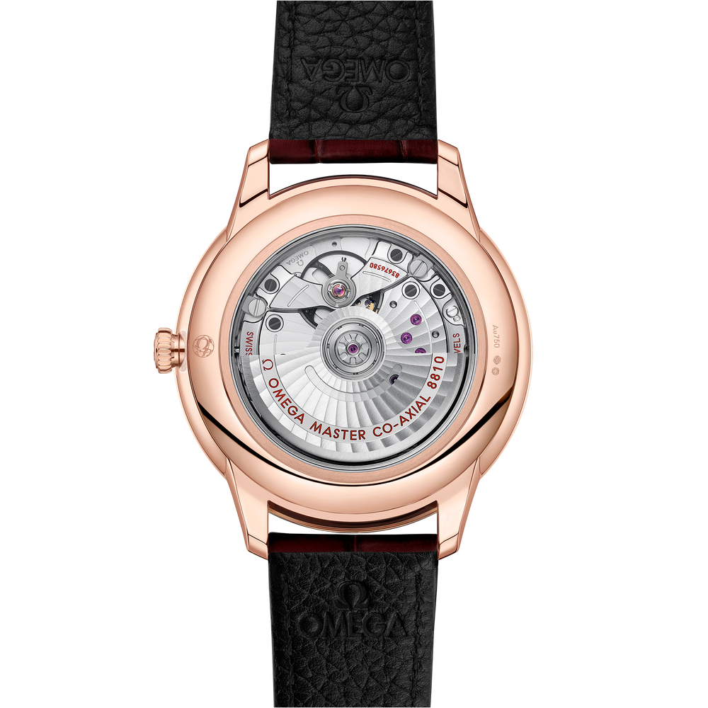This Master Chronometer certified watch is presented on a burgundy leather strap and is driven by the OMEGA Master Co-Axial Calibre 8810, which can be admired through the scratch-resistant sapphire crystal caseback.