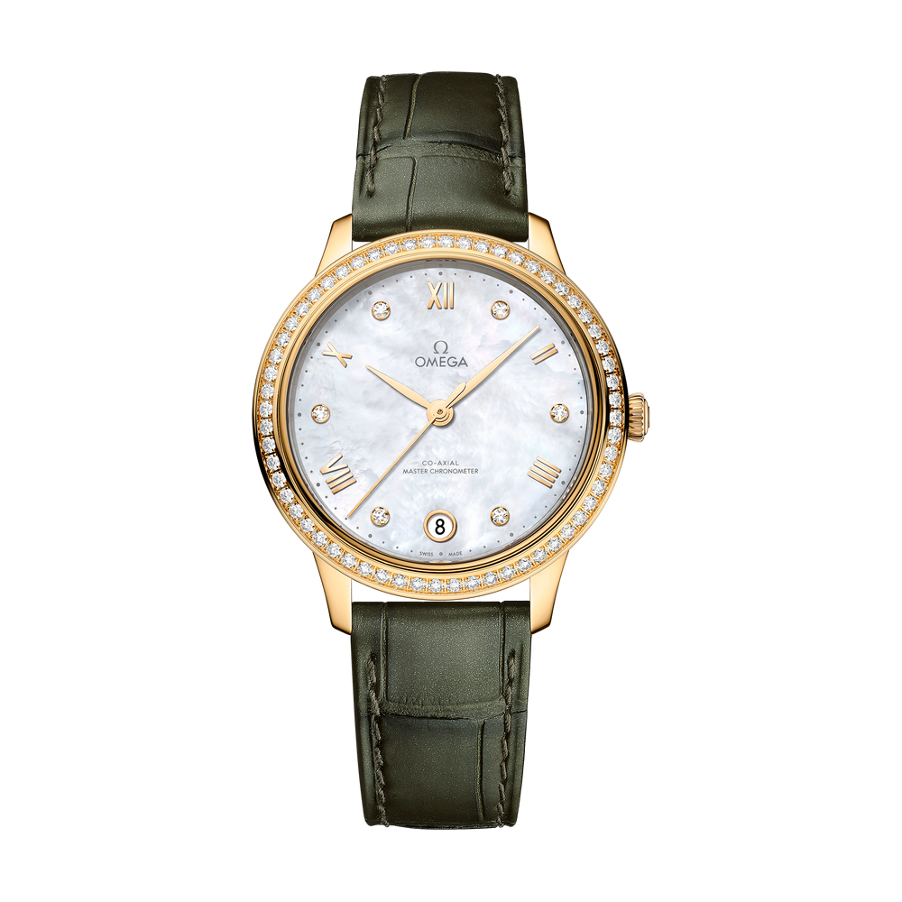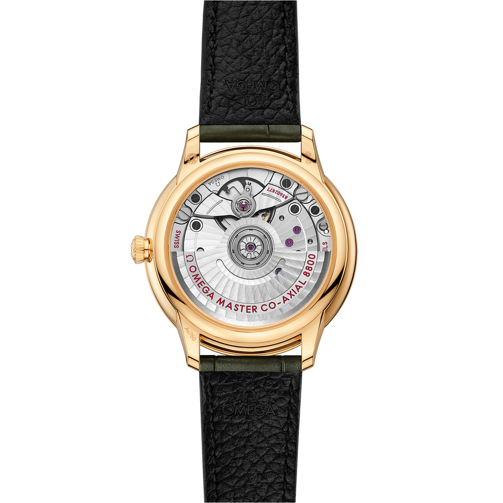 This Master Chronometer certified watch is presented on a shimmering olive green leather strap and is driven by the OMEGA Master Co-Axial Calibre 8800, which can be admired through the scratch-resistant sapphire crystal caseback.