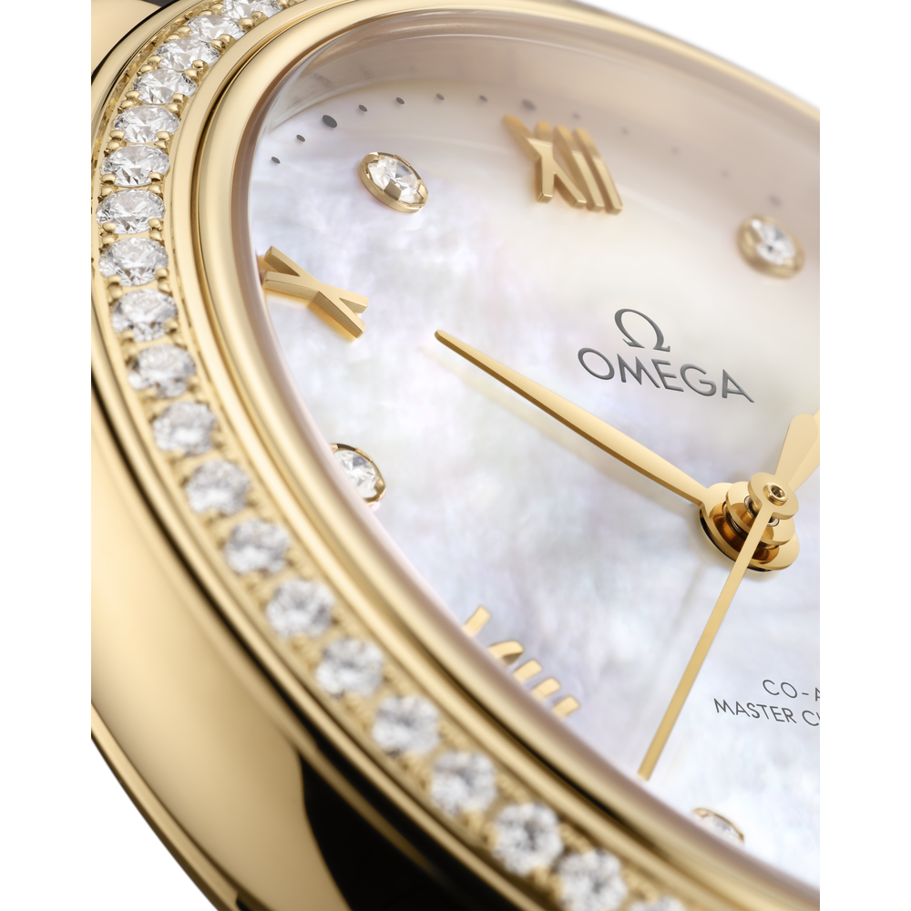 In this 34 mm 18K yellow gold model with its diamond-paved bezel, the dial is crafted from white mother-of-pearl. The display is distinguished by yellow gold-plated hands, as well as alternating Roman numerals and diamond markers.