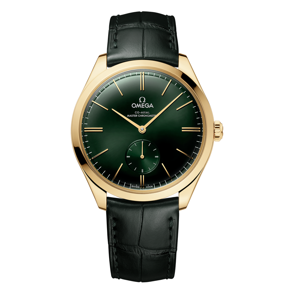This model has a polished 40 mm 18K yellow gold case, which is presented on a green leather strap. The domed green dial includes a Small Seconds display at 6H, along with hands and domed indexes in 18K yellow gold.