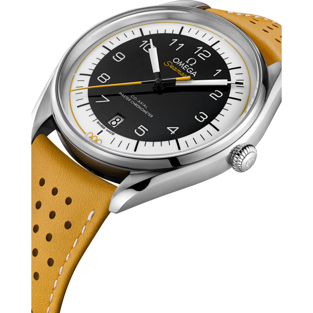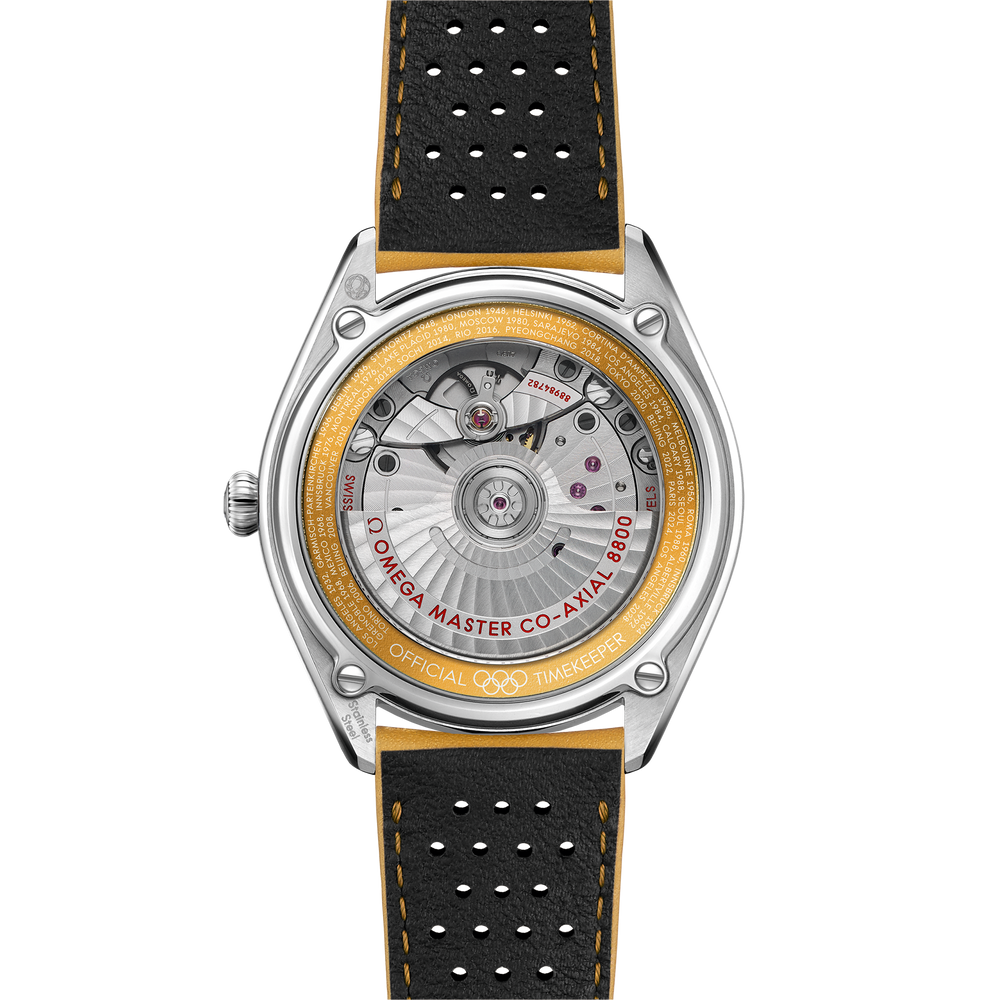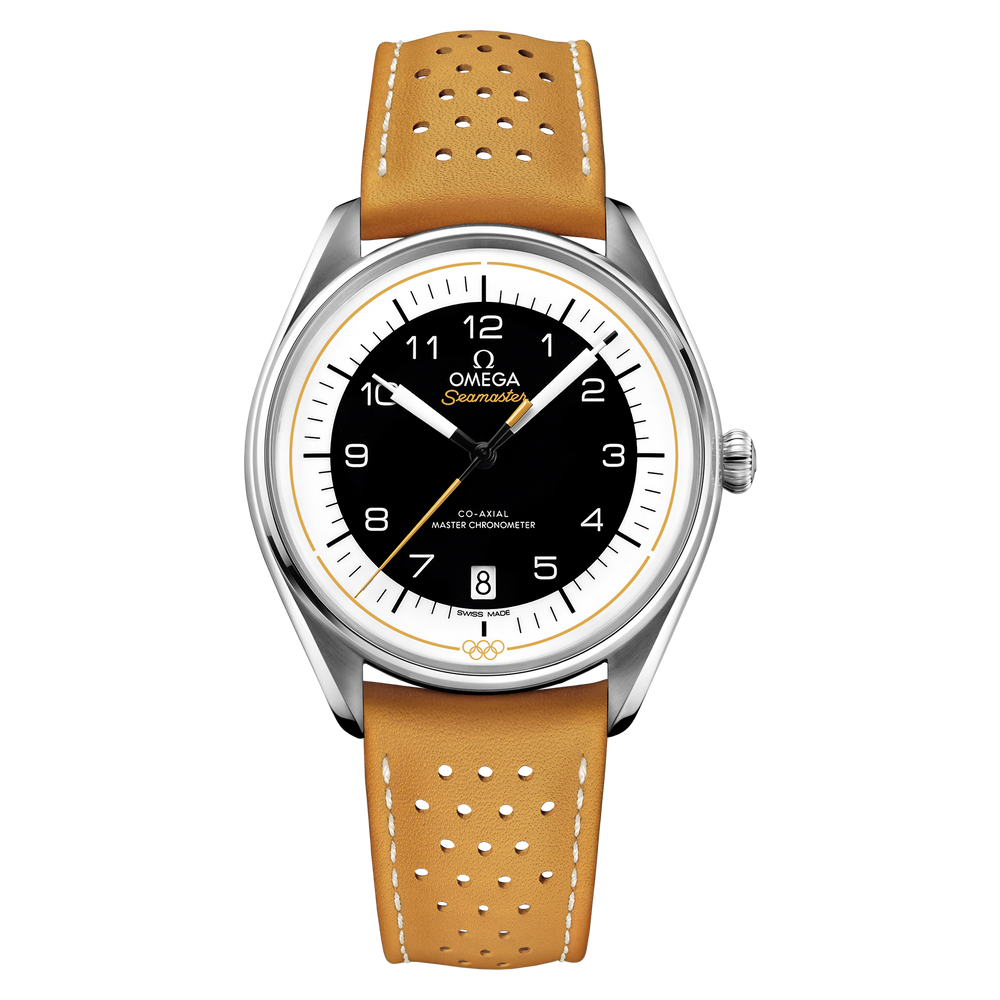 The Seamaster Olympic Games Collection is inspired by the Rings of the Olympic Games and the design of OMEGA’s timekeeping stopwatches from the past.This 39.5 mm model has a stainless steel case and a yellow, micro-perforated leather strap. The domed black and white dial includes sporty hands, a date window and an easy-to-read minute track, as well as a yellow pulse reader that enables the wearer to calculate their pulse beats-per-minute.On the caseback, there is a yellow anodized aluminium ring which includes all known host cities and dates from OMEGA’s Olympic Games journey, from Los Angeles 1932 up to Los Angeles 2028.Inside, the watch is driven by the Master Chronometer calibre 8800. Only 2,032 versions of this model have been created, with the Limited Edition number engraved on the side of the case.