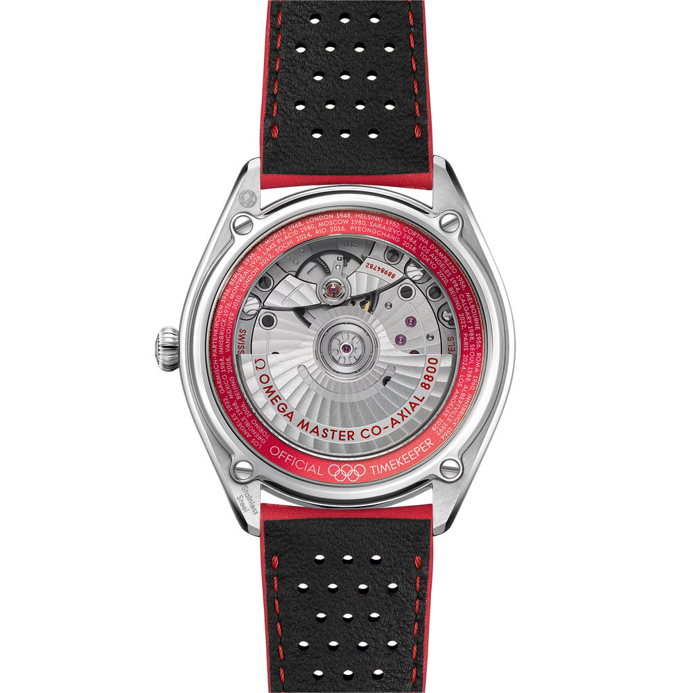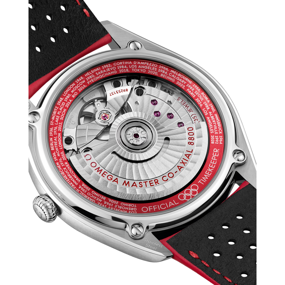 On the caseback, there is a red anodized aluminium ring which includes all known host cities and dates from OMEGA’s Olympic Games journey, from Los Angeles 1932 up to Los Angeles 2028.