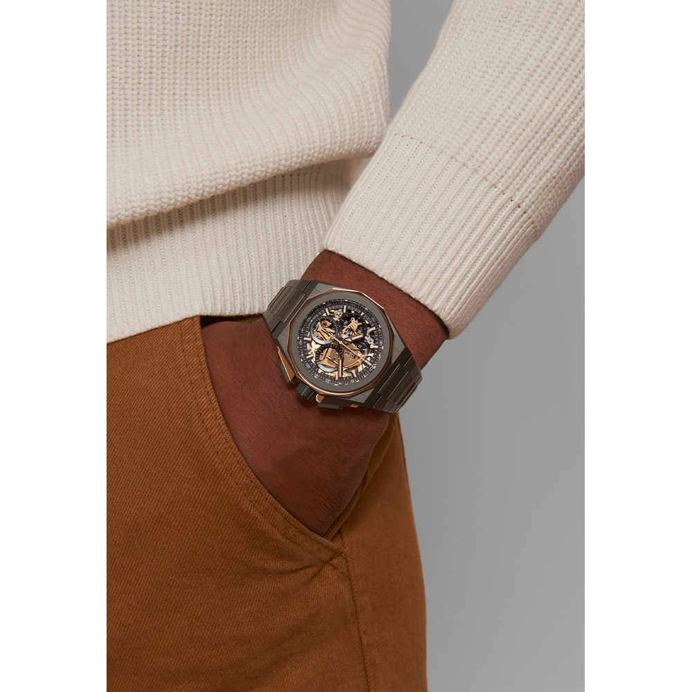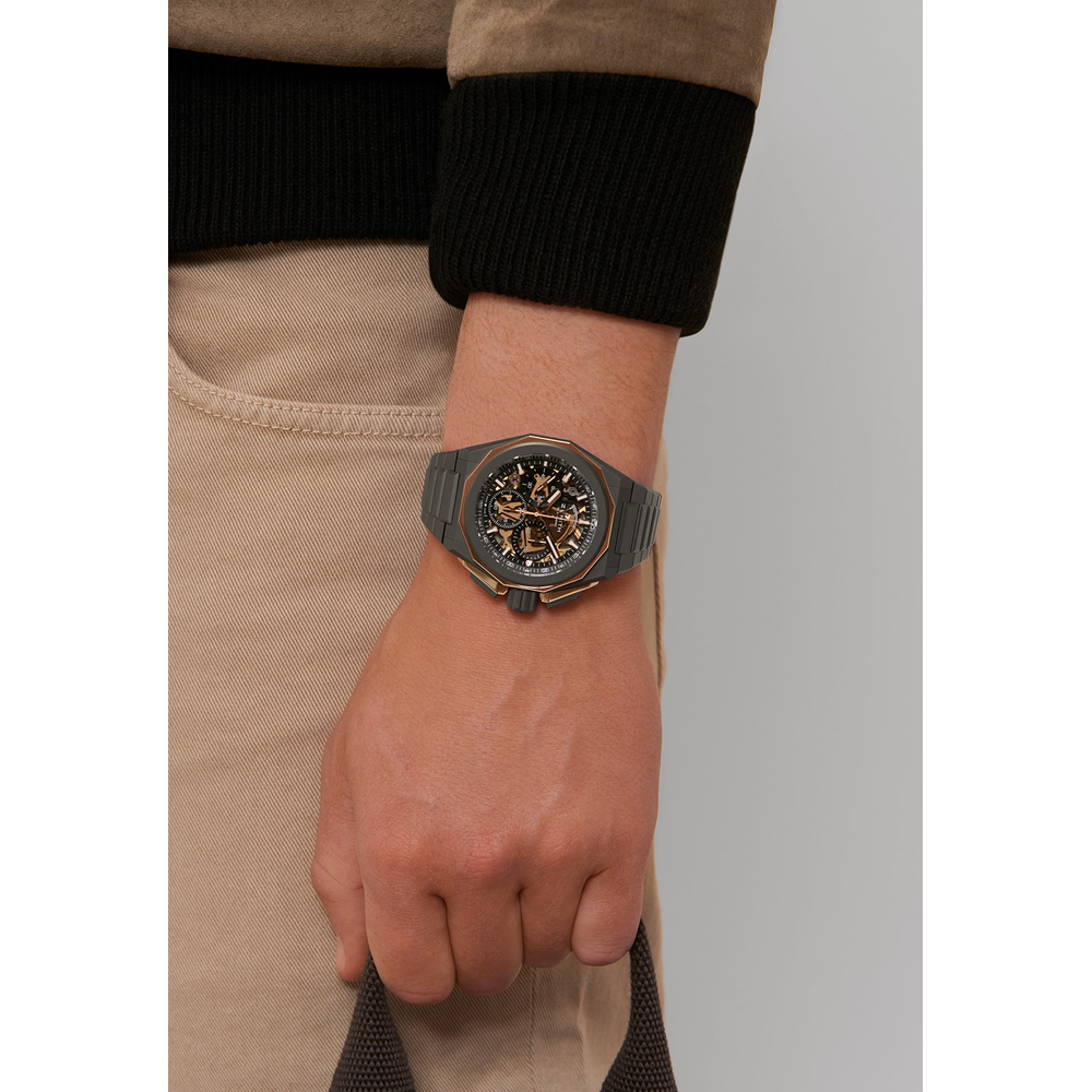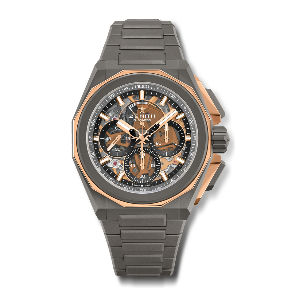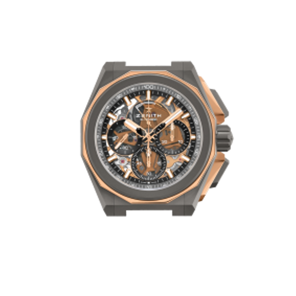 The DEFY Extreme 1/100th of a second chronograph is made in light yet robust titanium with an entirely matte finish with rose gold elements. The tinted sapphire dial reveals the El Primero 21 automatic chronograph movement with two escapements. The DEFY Extreme watch comes with a titanium strap as well as a rubber strap and a Velcro strap.