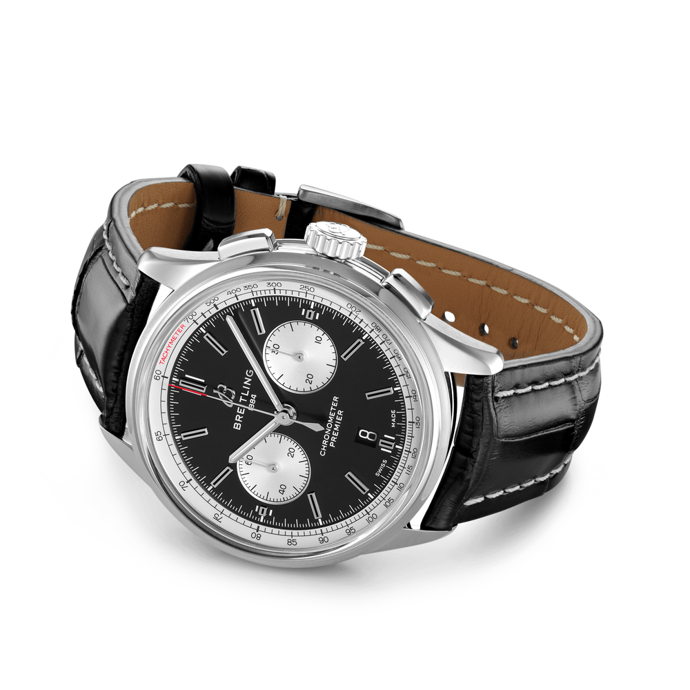 Designed by Willy Breitling in the 1940s, the Premier was the brand’s first-ever watch dedicated purely to style. Featuring elegant details and modern-retro touches, this reinterpretation of the Premier upholds its ancestor’s reputation as “a watch of impeccable taste.” On top of its rectangular chronograph pushers and bi-compax chronograph panda look, the Premier displays a variety of elegant design details such as grooves on the case-side and open sapphire caseback. The Premier B01 Chronograph 42 is available in an array of dial colors and with case materials that include stainless steel and 18k red gold. Offered either with a matching bracelet, or a choice of alligator or nubuck calfskin leather strap, this Premier is powered by the in-house Breitling Manufacture Caliber 01, a COSC-certified chronometer.