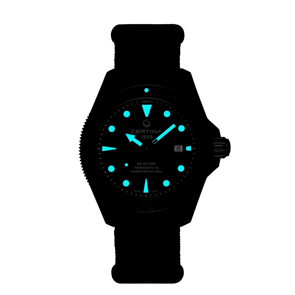 Material: Super-LumiNova SLN is the acronym for Super-LumiNova®, a phosphorescent luminescent material. The BG W9 type of SLN, used by Certina, emits the stored light in the form of a bluish glow in the dark. SLN poses no risk to health and is used to coat hands, indices and bezels. Its brightness decreases in the dark after some time, but it is automatically recharged when light strikes it.