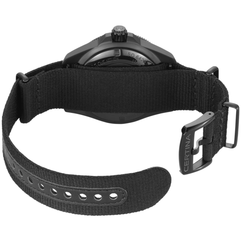 Water resistance: Diver's watch 300m according to ISO 6425:2018 A divers' watch is a water-resistant and pressure-resistant wristwatch. Certina tests each and every one of these timepieces in water for three hours, as is required by ISO standard 6425. This standard includes a whole host of demanding criteria that a watch must meet in order to be able to be officially called a "divers' watch":o A device for preselecting a period of time (e.g. rotating bezel)o Readability from 25 cm in complete darkness o Proper functionality in water o Straps, crowns and other components resistant to external forces, salt water and thermal shocko Antimagnetic propertieso Water-resistant to the given diving depth plus 25% of this depth o Shock resistance