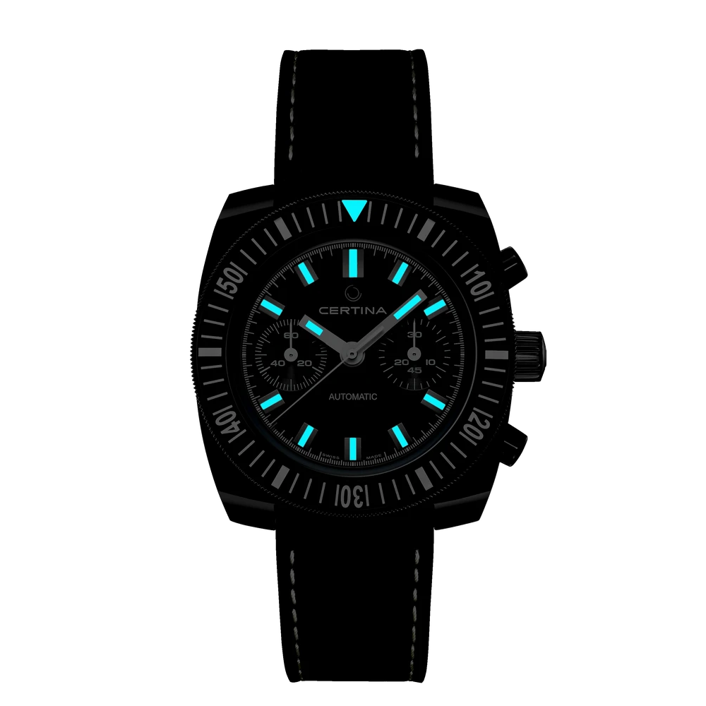 Material: Super-LumiNova SLN is the acronym for Super-LumiNova®, a phosphorescent luminescent material. The BG W9 type of SLN, used by Certina, emits the stored light in the form of a bluish glow in the dark. SLN poses no risk to health and is used to coat hands, indices and bezels. Its brightness decreases in the dark after some time, but it is automatically recharged when light strikes it.