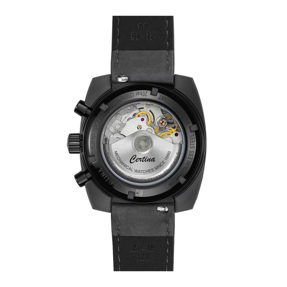 A tribute to the 1960s, the DS Chronograph Automatic 1968 is a men's watch that captivates with its bold and timeless character. Equipped with a high-precision automatic movement featuring a silicon balance spring, it ensures exceptional reliability. The integrated chronograph offers an ideal functionality for performance enthusiasts, while the unidirectional rotating bezel enhances its sporty appearance. Designed for modern adventurers, it withstands a pressure of 20 bar, thus combining style with practicality. Perfect for accompanying every moment, it showcases Certina's watchmaking expertise, meeting contemporary demands.