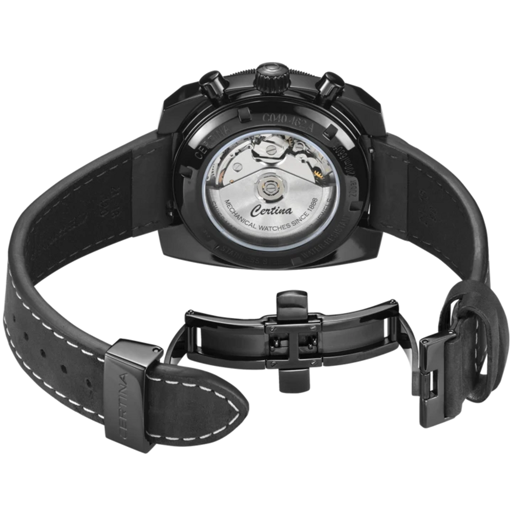 Material: Quick-release system Various Certina models are fitted with a sophisticated quick-change mechanism that enables the wearer to remove the strap easily and swap it for another one. The spring pins in these straps have minute levers that can be pushed down and unlocked with ease., Leather
