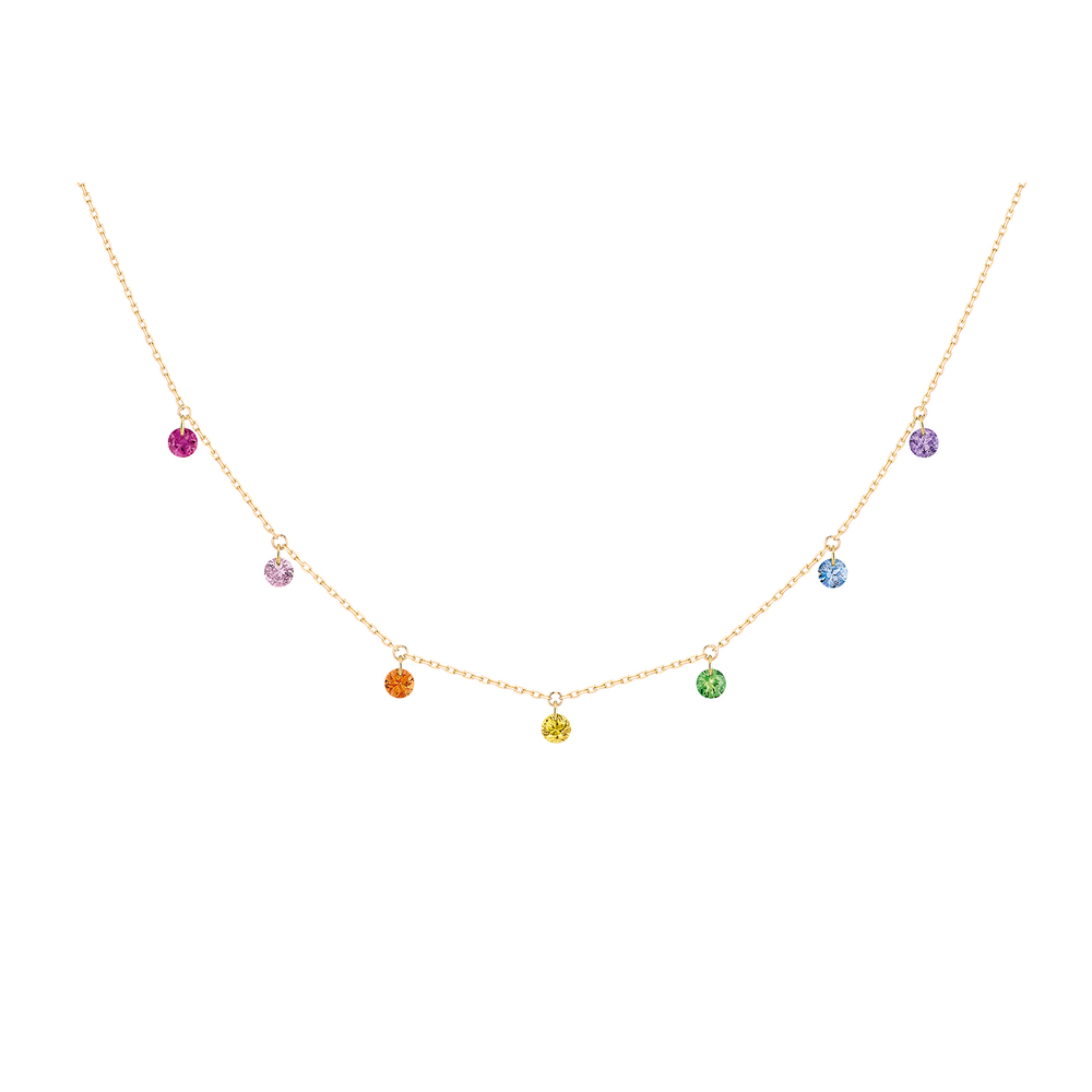 The RAINBOW necklace, part of the CONFETTI collection present 7 natural stones, 0,90 carat approx. total weight : a ruby, a pink sapphire, an orange sapphire, a yellow sapphire, a blue sapphire, a tsavorite and an amethyst.