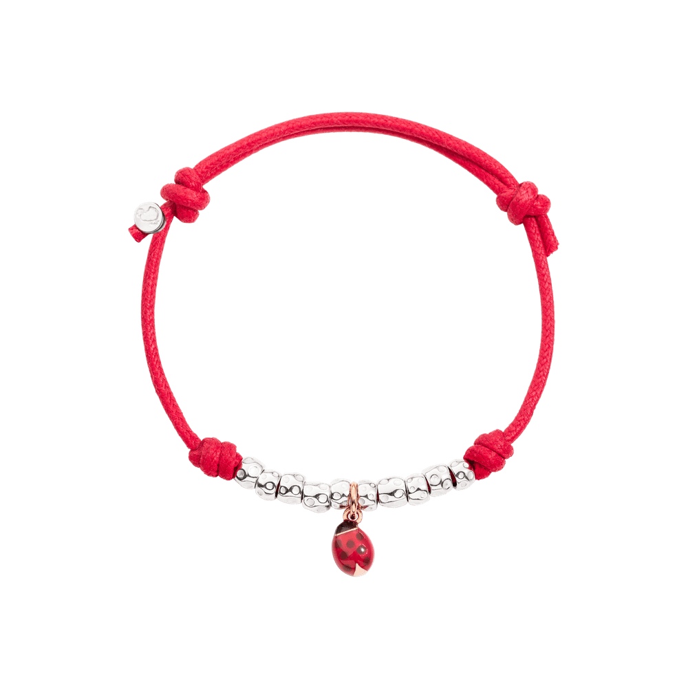 Red cord bracelet with silver clasp, 9 K rose gold and coloured enamel ladybird charm, and silver Granelli.