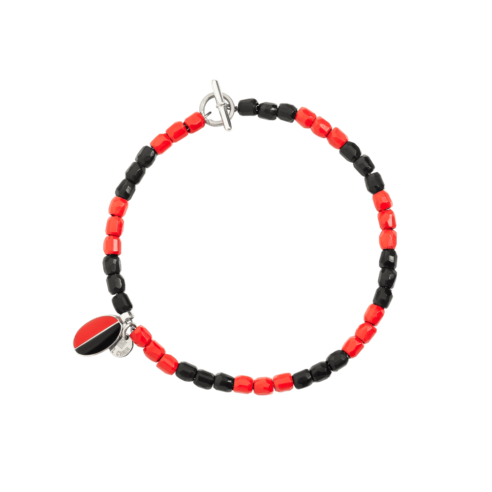 Mini Granelli bracelet in recycled red and black plastic. Chain, brisè closure and plaquette in steel, T-bar in .925 silver. Charm in .925 silver and red and black enamel with "1899" engraving on back side.