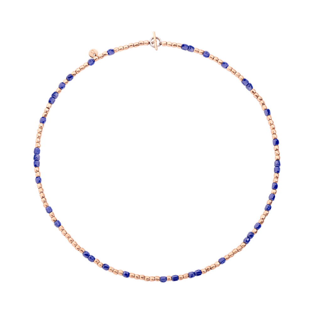 Mini granelli necklace in 9K rose gold and blue ceramic, chain and brisè ring closure in steel, t-bar in 9K rose gold, plaquettes in 9K rose gold and steel. Needle in sterling silver included.