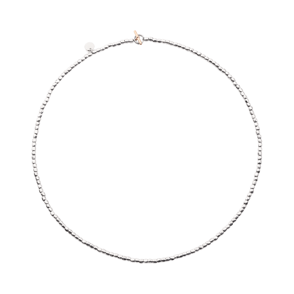 Mini granelli necklace in sterling silver, chain and brisè ring closure in steel, t-bar in 9K rose gold, plaquettes in silver and steel. Needle in sterling silver included.