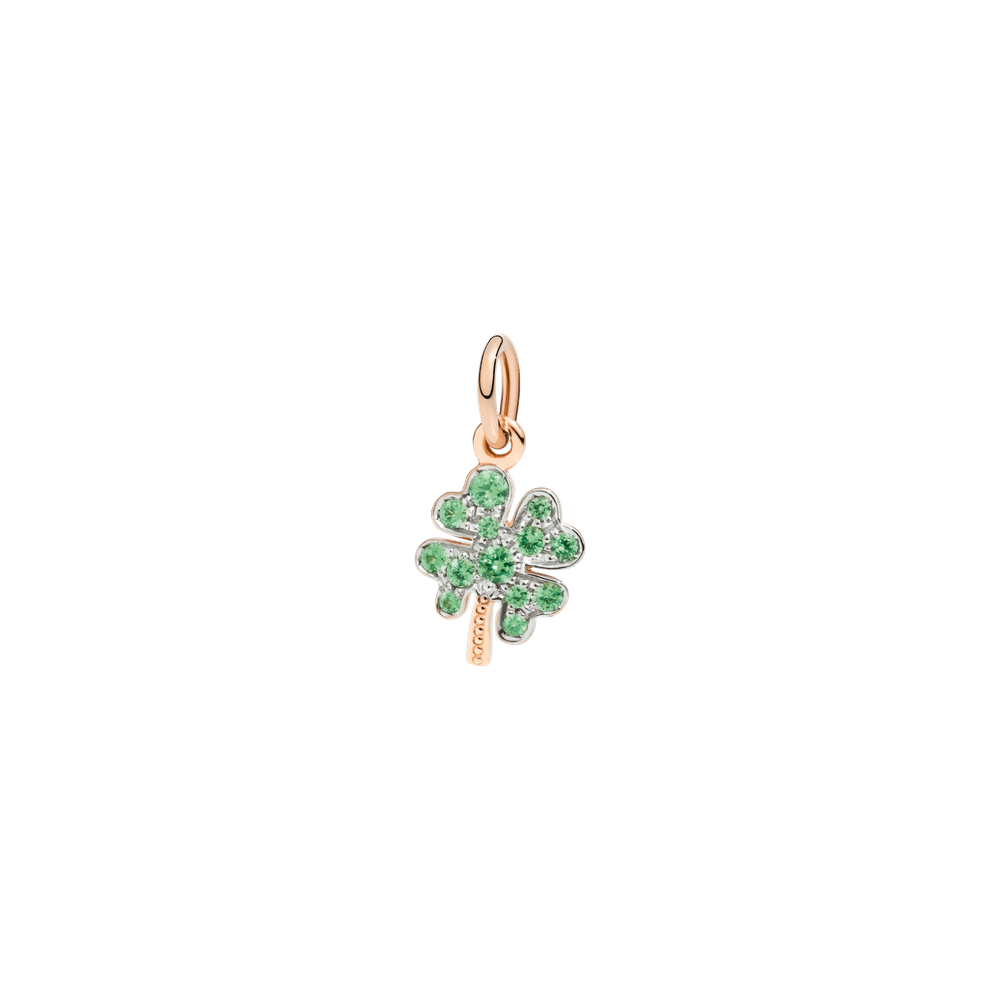 Four leaf clover charm in 9K rose gold with 13 light tsavorites (0.20 ct) - small model. Black cord included.