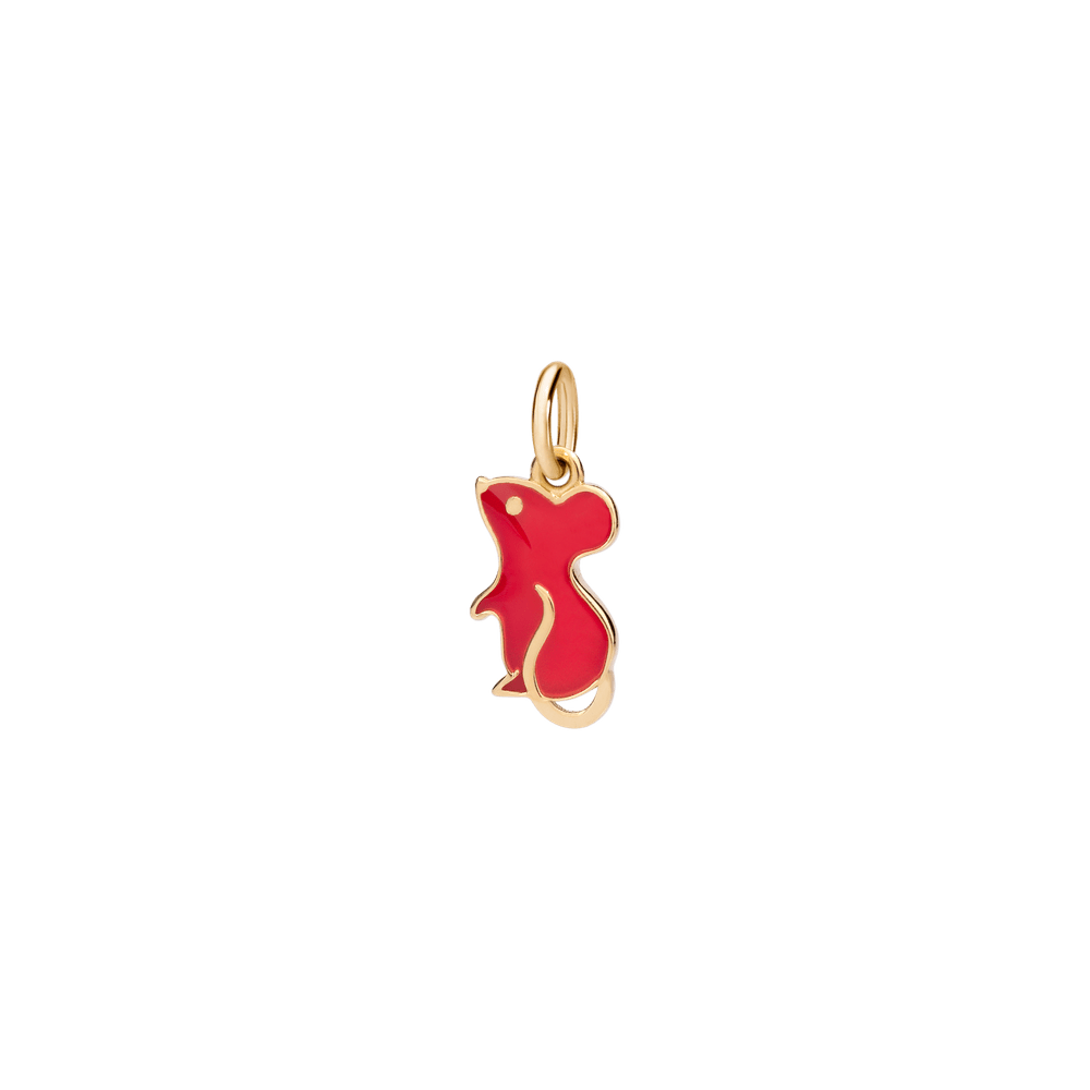 Mouse charm in 18k yellow gold and red enamel. Black cord included.