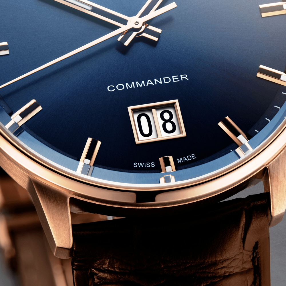 Family Internet Text: The Commander Big Date Swiss watch celebrated the 100th anniversary of the brand in 2018. Its large date aperture at 6 o'clock offers unrivalled date legibility. The sunray satin-finished dial is extremely pure and protected by an elegant round case in satin-finished stainless steel and enhanced by a polished bezel. This anthology and iconic piece is fitted with the Caliber 80, an automatic watch movement that offers up to 80 hours of power reserve.