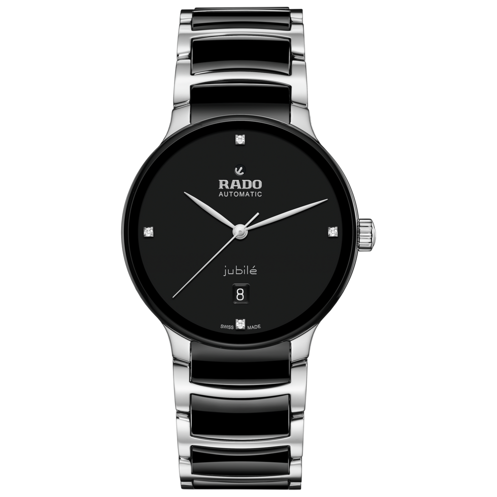 The classic Centrix Automatic Diamonds watch has been reworked not only technically, but also aesthetically. The modified model has a rounded sapphire crystal that extends all the way to the edge, as well as a curved case blending with the curved crystal edge. The adjusted case lugs and the bracelet made of polished stainless steel with black high-tech ceramic middle links complete the overall appearance of this iconic timepiece. The black lacquered dial with 4 diamonds, emphasised with the printed “jubilé” logo, matches perfectly with the rhodium-coloured hands. Inside, the three-hand calibre R763 movement exceeds standard accuracy test requirements from 3 to 5 positions, thanks to its antimagnetic Nivachron™ hairspring for increased reliability and accuracy. The watch is water resistant down to 50 m and offers 80 hours of power reserve.