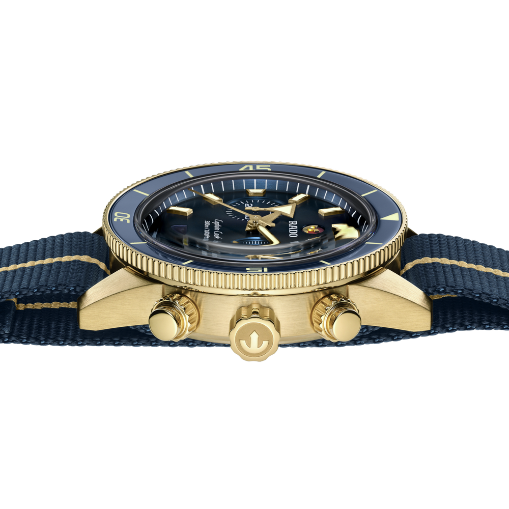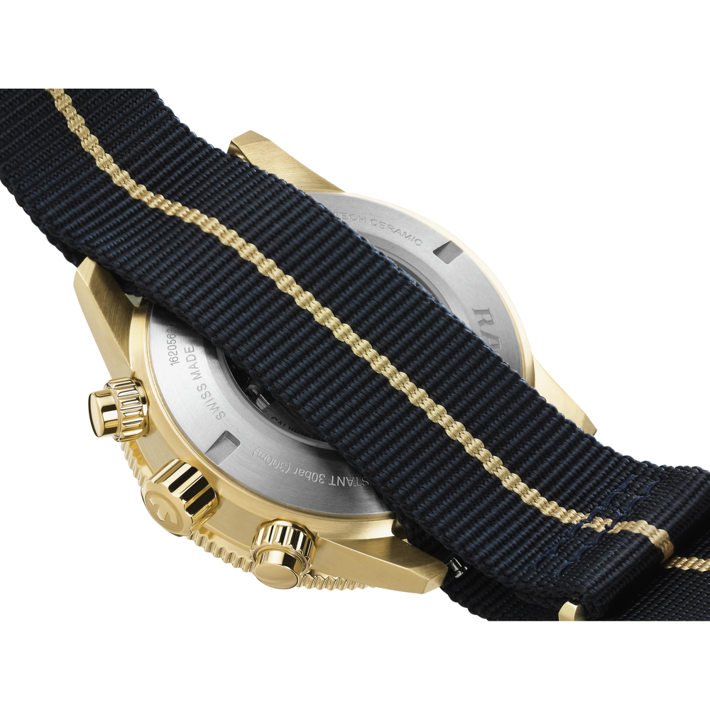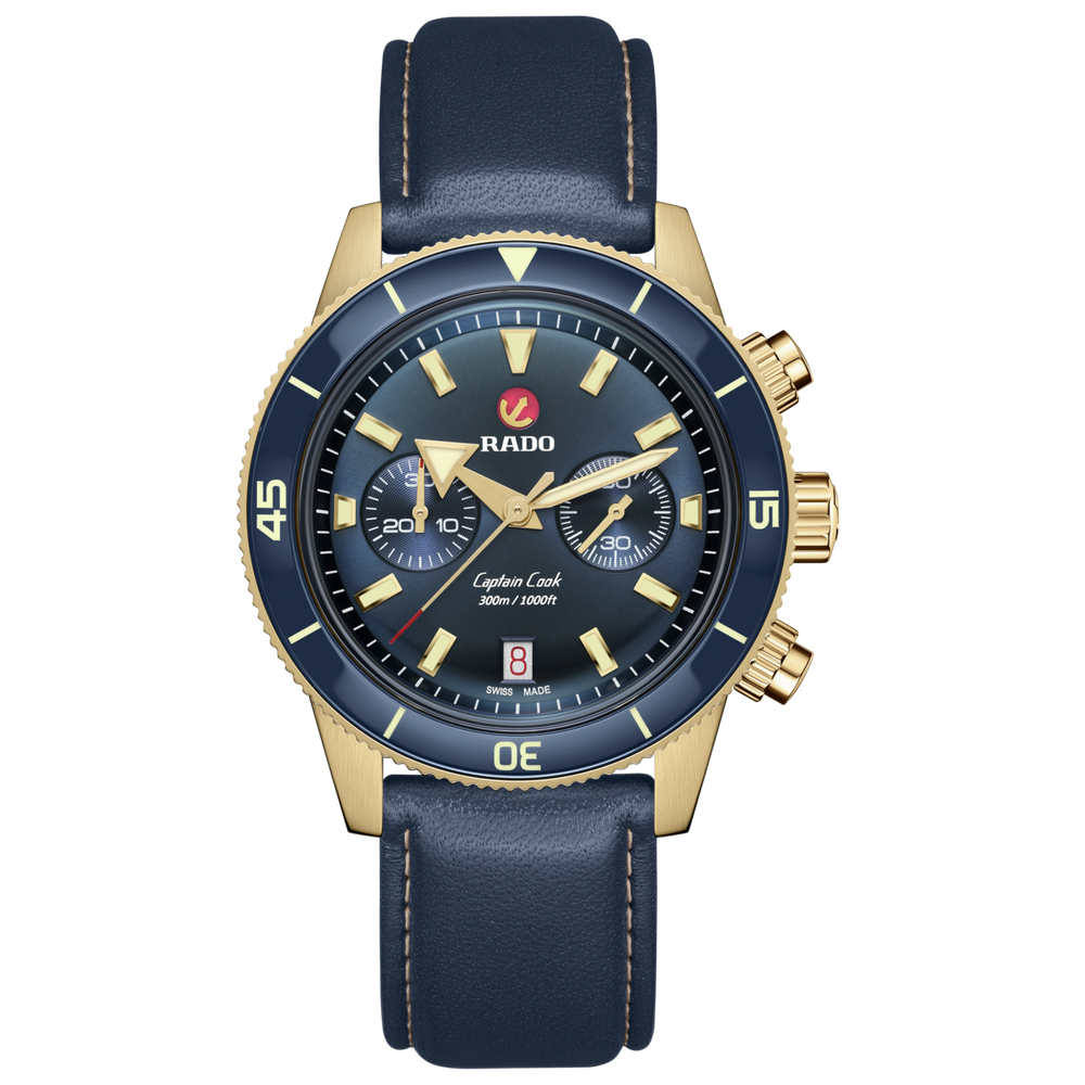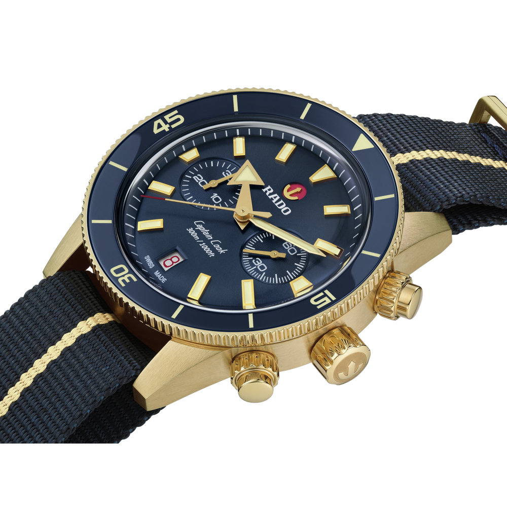 The Captain Cook Chronograph wears a characteristic box-shaped, scratch-resistant sapphire crystal with anti-reflective treatment on both faces. The thin, stylish 43 mm brushed bronze case features a polished blue high-tech ceramic inlay on the bezel, complementing the sunray blue dial. The numbers, markers and triangles are treated with Super-LumiNova®. Inside, the new, thinner R801 automatic movement, with 37 jewels, five hands and 59 hours of power reserve thanks to an antimagnetic Nivachron™ hairspring, exceeds standard test requirements from 3 to 5 positions for higher accuracy. The model comes with a fabric strap with a gold-coloured stripe down the centre, as well as a blue leather strap and an additional fabric strap in deep blue.