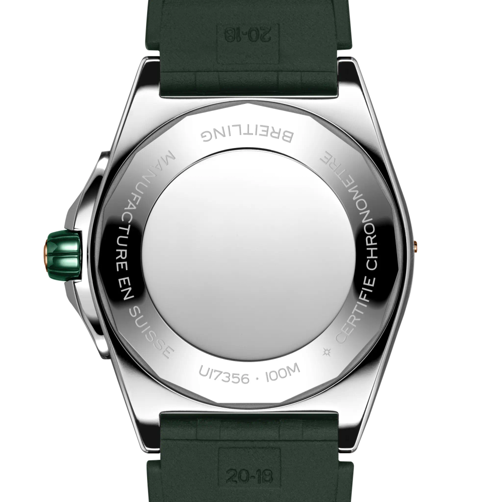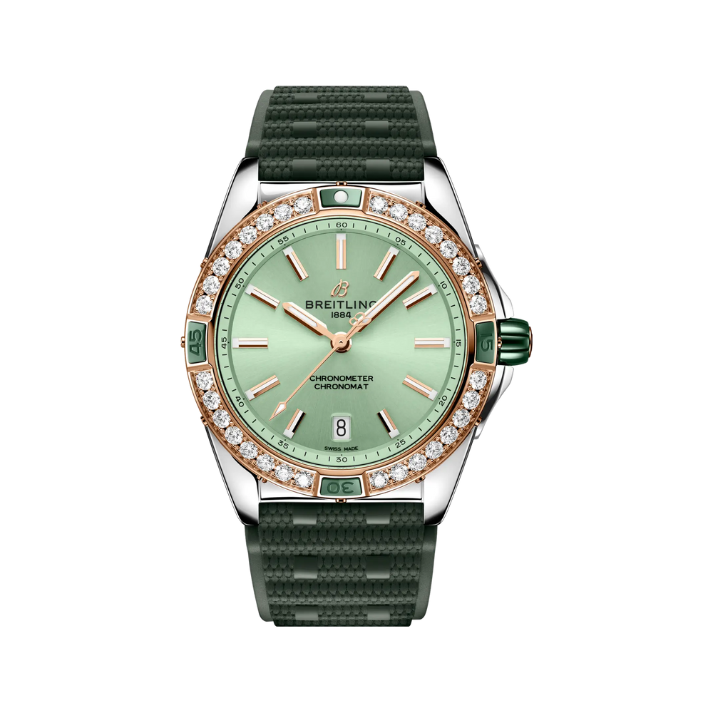 The Super Chronomat Automatic 38 is designed to make a statement, whether paired with a power suit or a t-shirt and jeans. You can tell a Super from the rest of the Chronomat family by the ceramic rider tabs and crown, and the rubber rouleaux bracelet only available with this supercharged line.