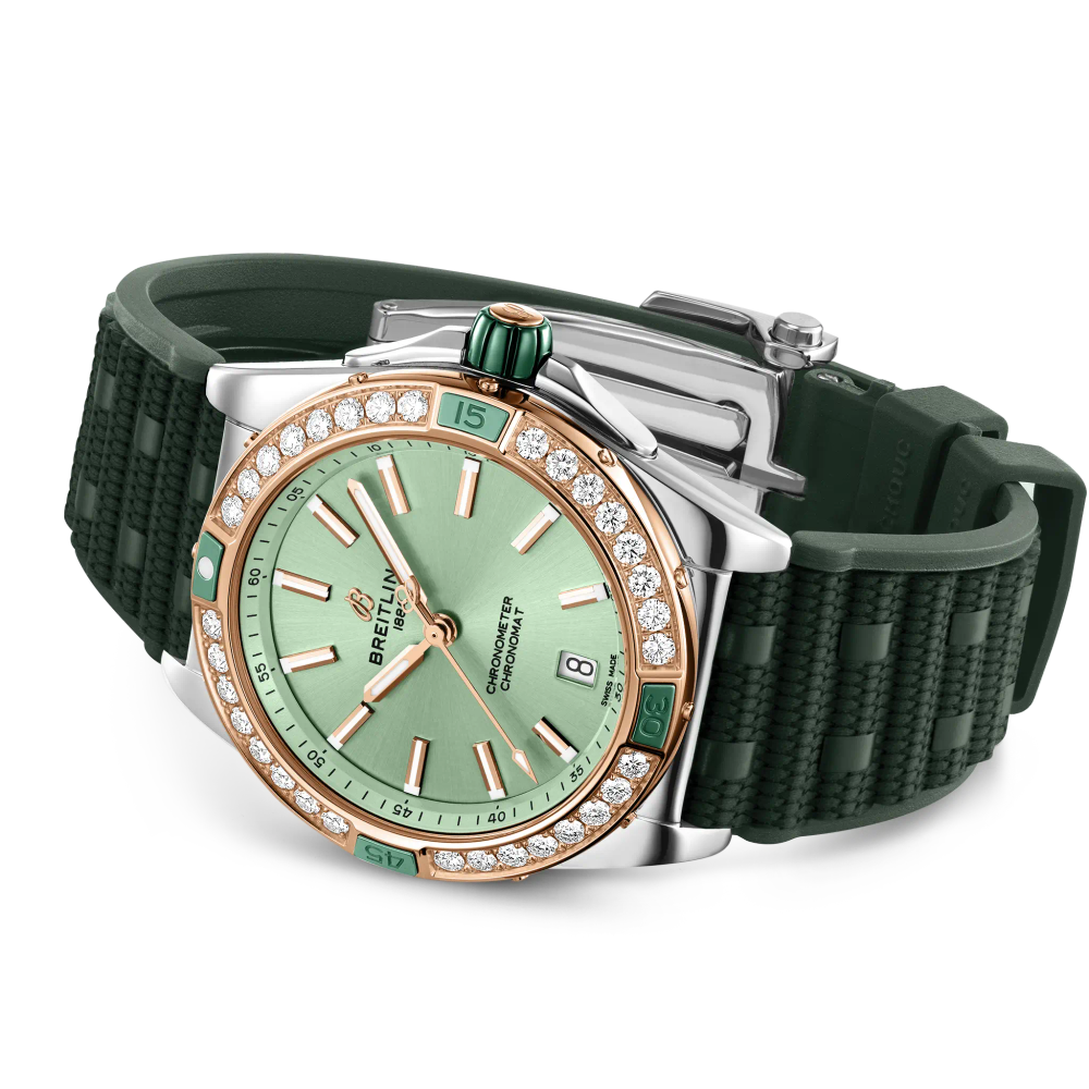 Aside from its enhanced presence, the Automatic 38 also has a radiant side. Oversized lab-grown diamonds make the rounds of its 18k red gold or stainless-steel bezel. Its dial colors add just the right amount of eye candy. Pair a favorite shade with a choice of bracelet or strap.