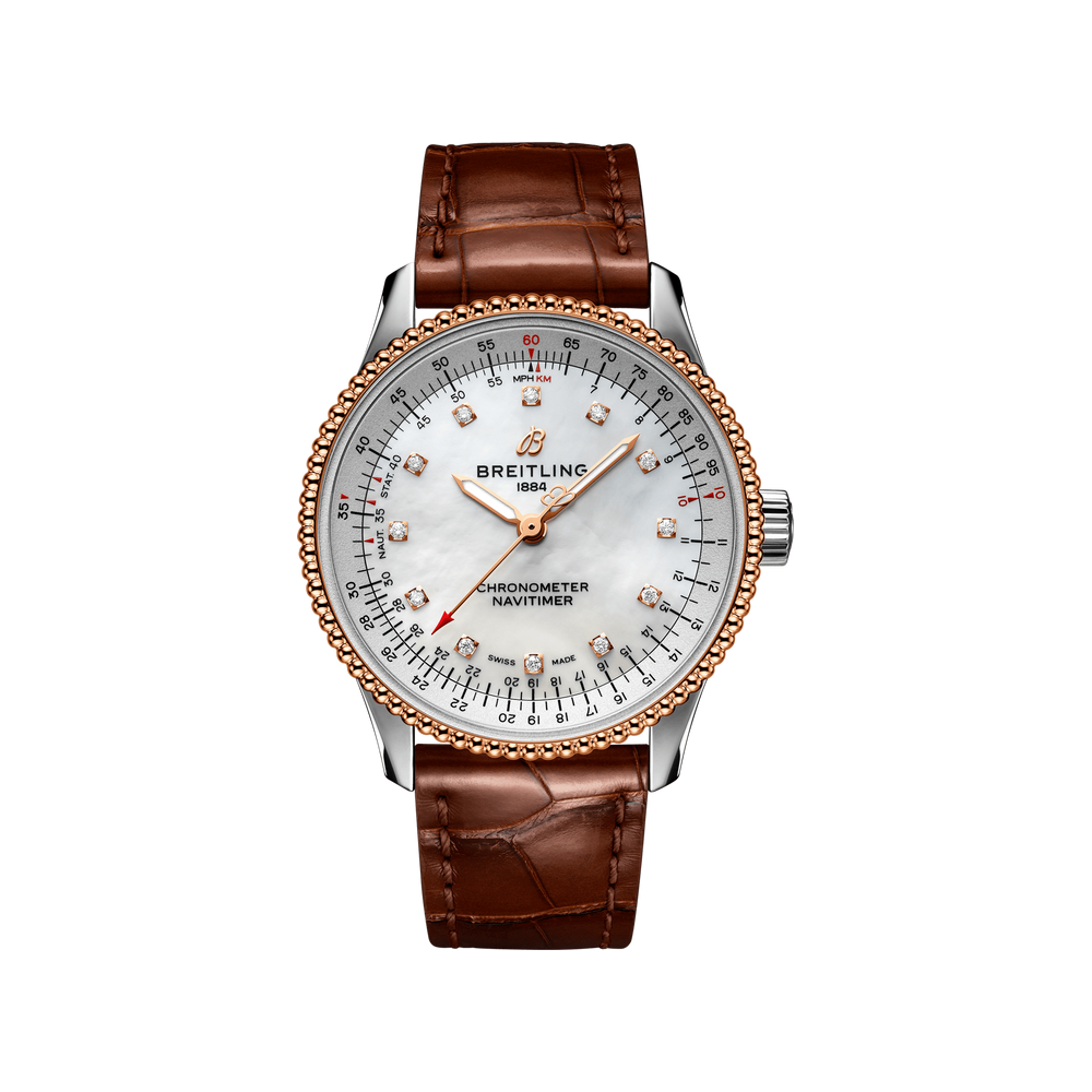 Available in a variety of materials including stainless steel and 18k red gold, the 35 mm case features a beaded bezel and a range of elegant dial colors, as well as diamond-set white mother of pearl. Offered either with a matching bracelet or alligator strap that fits both a stainless steel pin or folding buckle, the Navitimer Automatic 35 is powered by the Breitling Caliber 17, a COSC-certified chronometer.