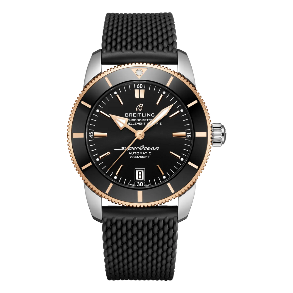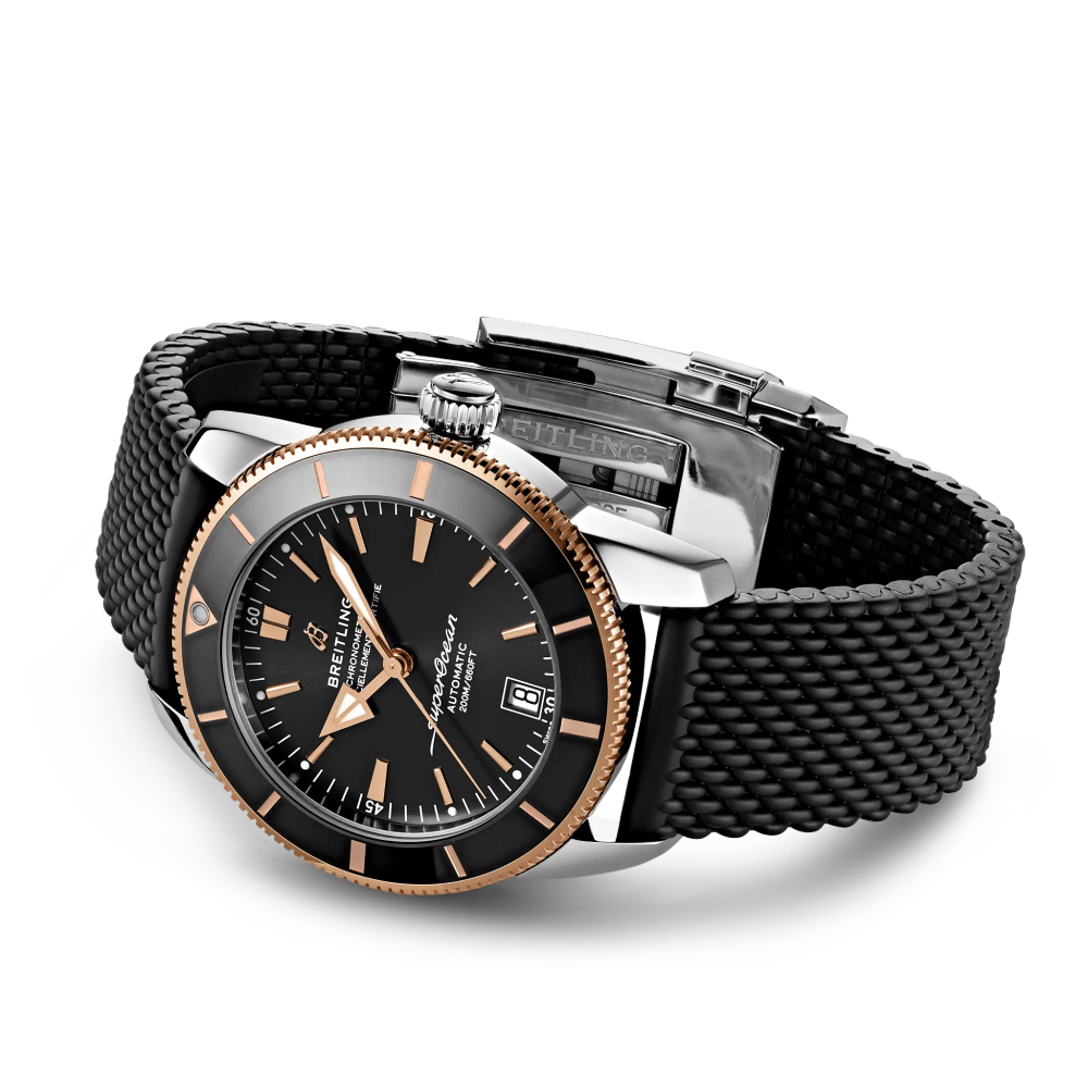 Featuring the iconic triangular-shaped hands as well as a unidirectional bezel with a polished ceramic ring, the Superocean Heritage is an elegant looking diver’s watch. Available in a variety of sizes and materials including stainless steel and 18k red gold, the Superocean Heritage B20 Automatic features a range of black, blue or green dials. Offered either with a matching mesh bracelet, or a “mesh-styled” rubber strap fitting a folding buckle, this Superocean Heritage is powered by the Breitling Manufacture Caliber B20, a COSC-certified chronometer based on the Tudor Caliber MT5612.